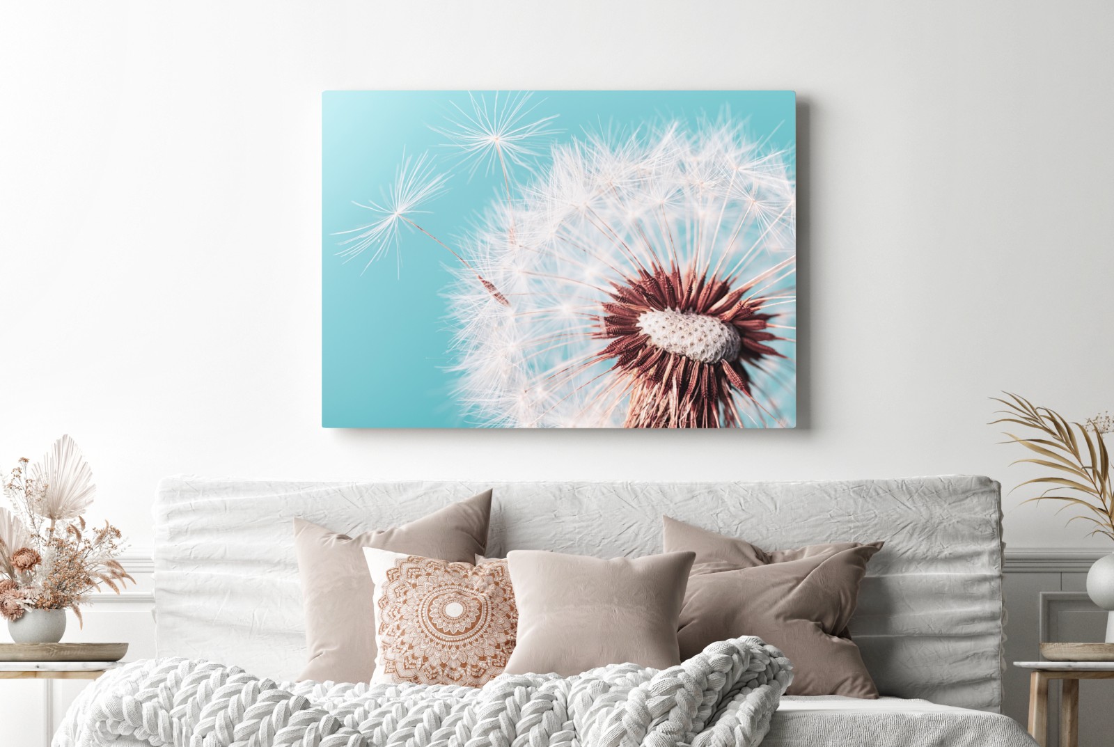 Leinwandbild Zarter löwenzahn vor türkisfarbenem hintergrund