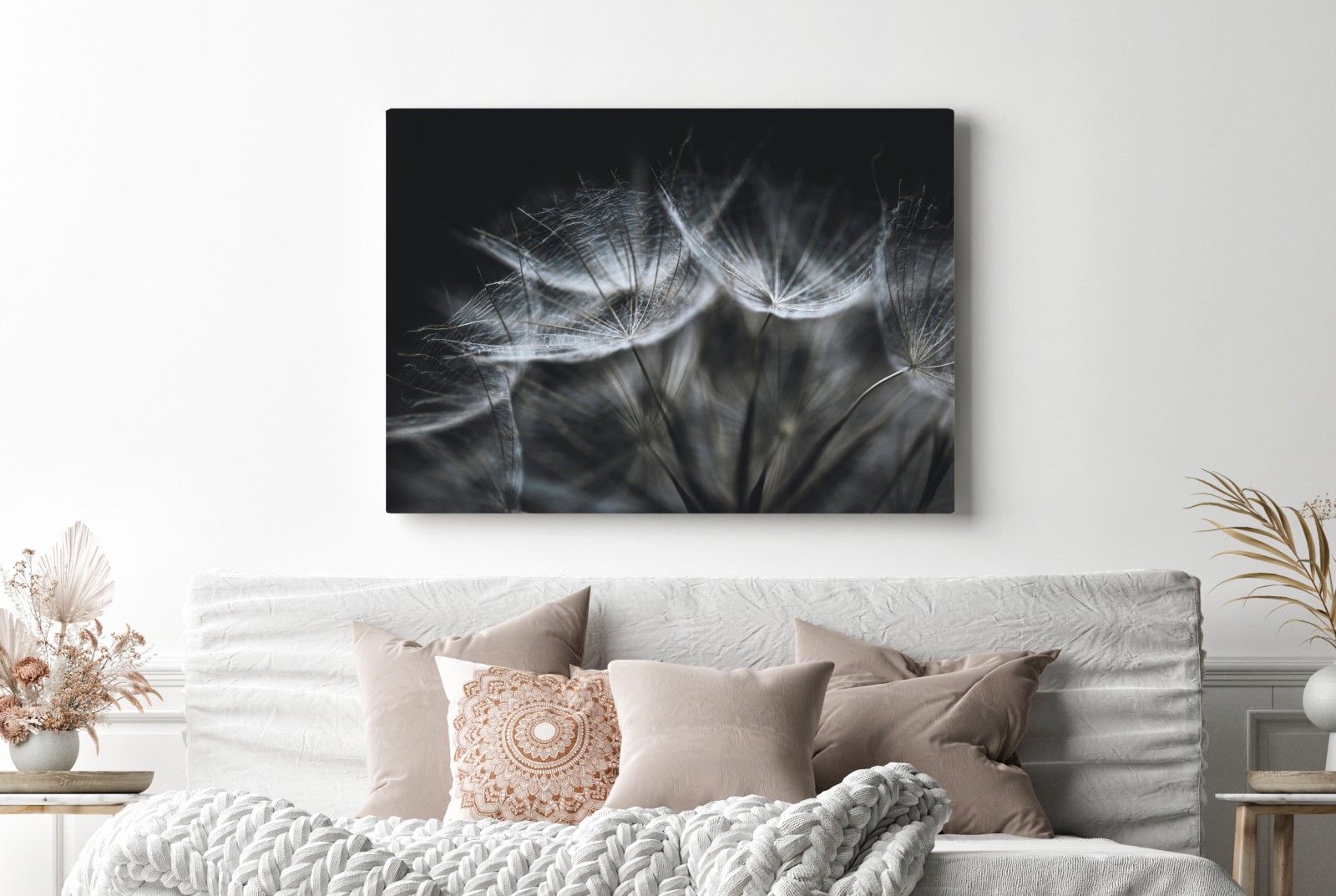 Leinwandbild Zarte löwenzahnsamen in monochrom