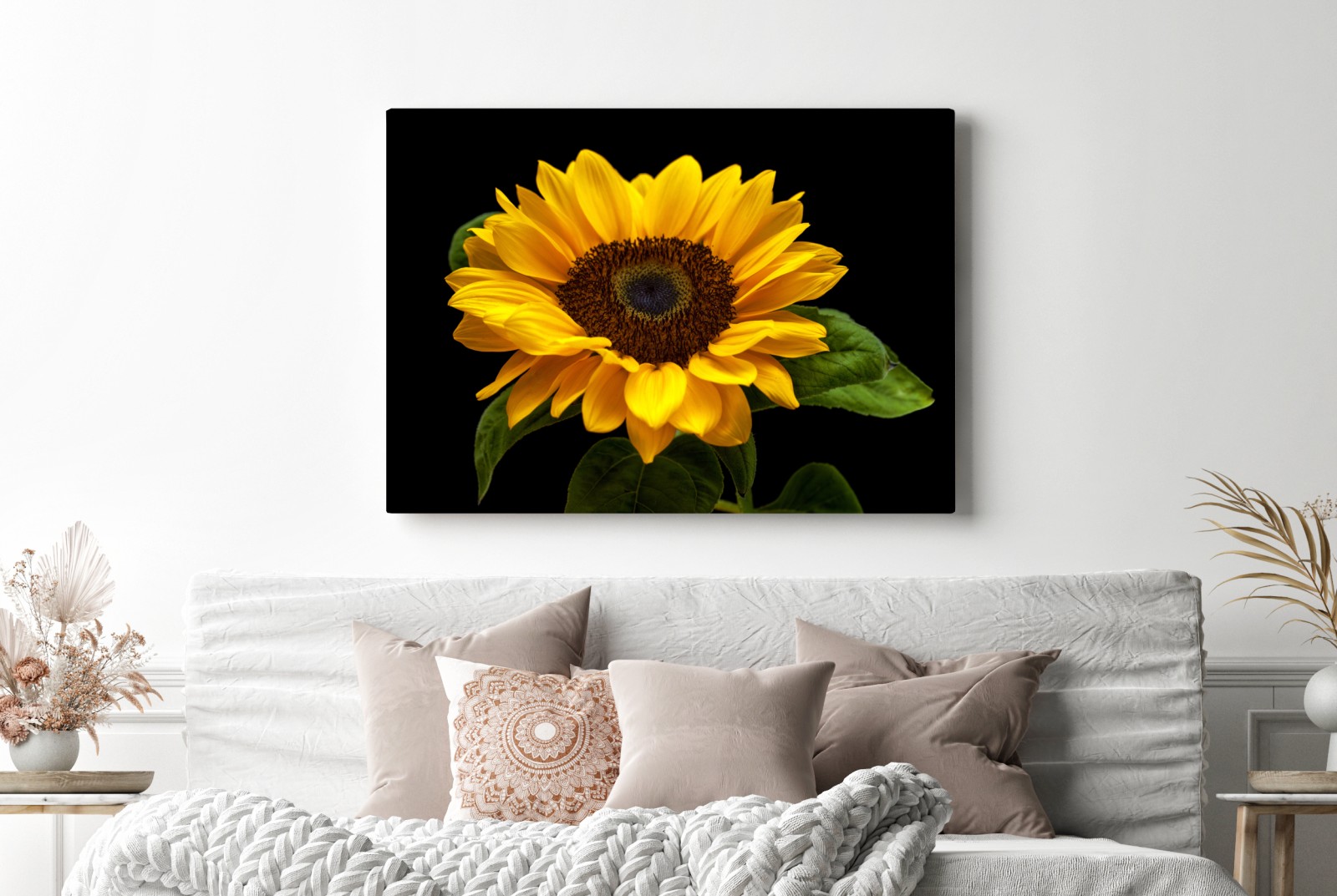 Leinwandbild Leuchtende sonnenblume auf schwarzem hintergrund