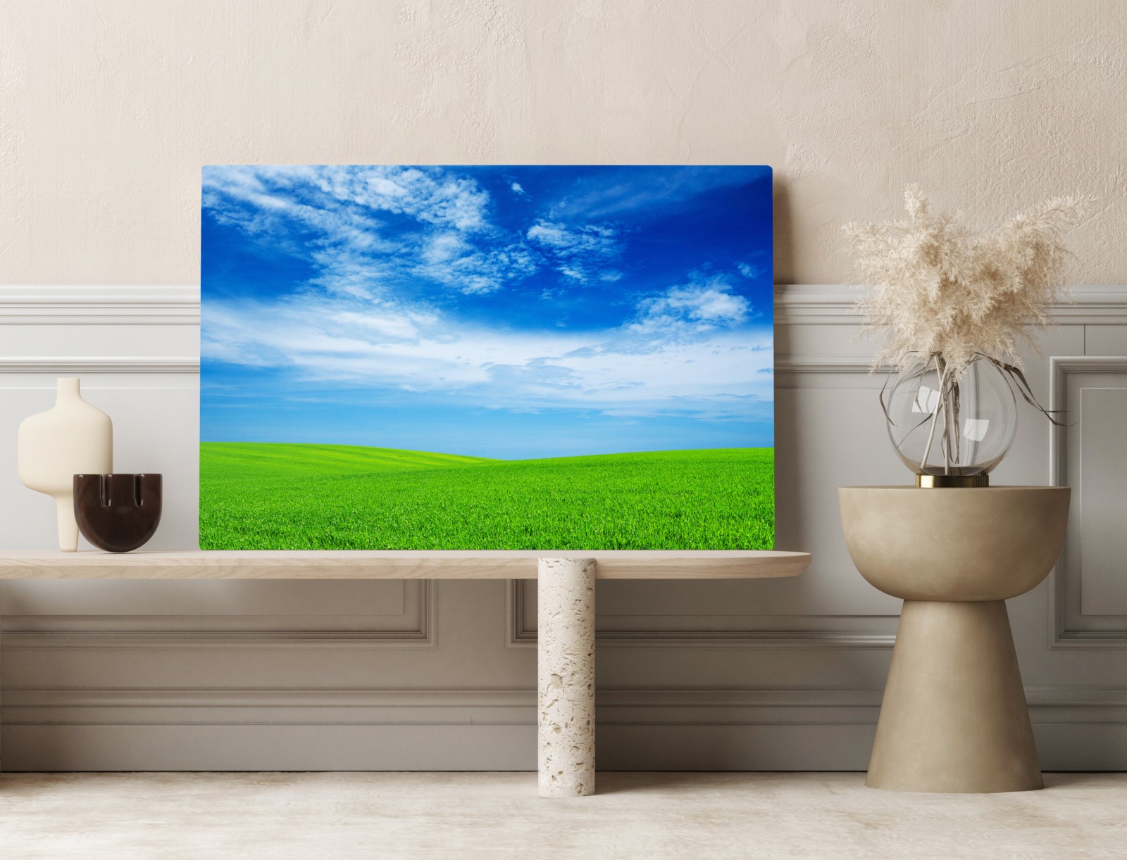 Leinwandbild Grüne wiese unter blauem himmel