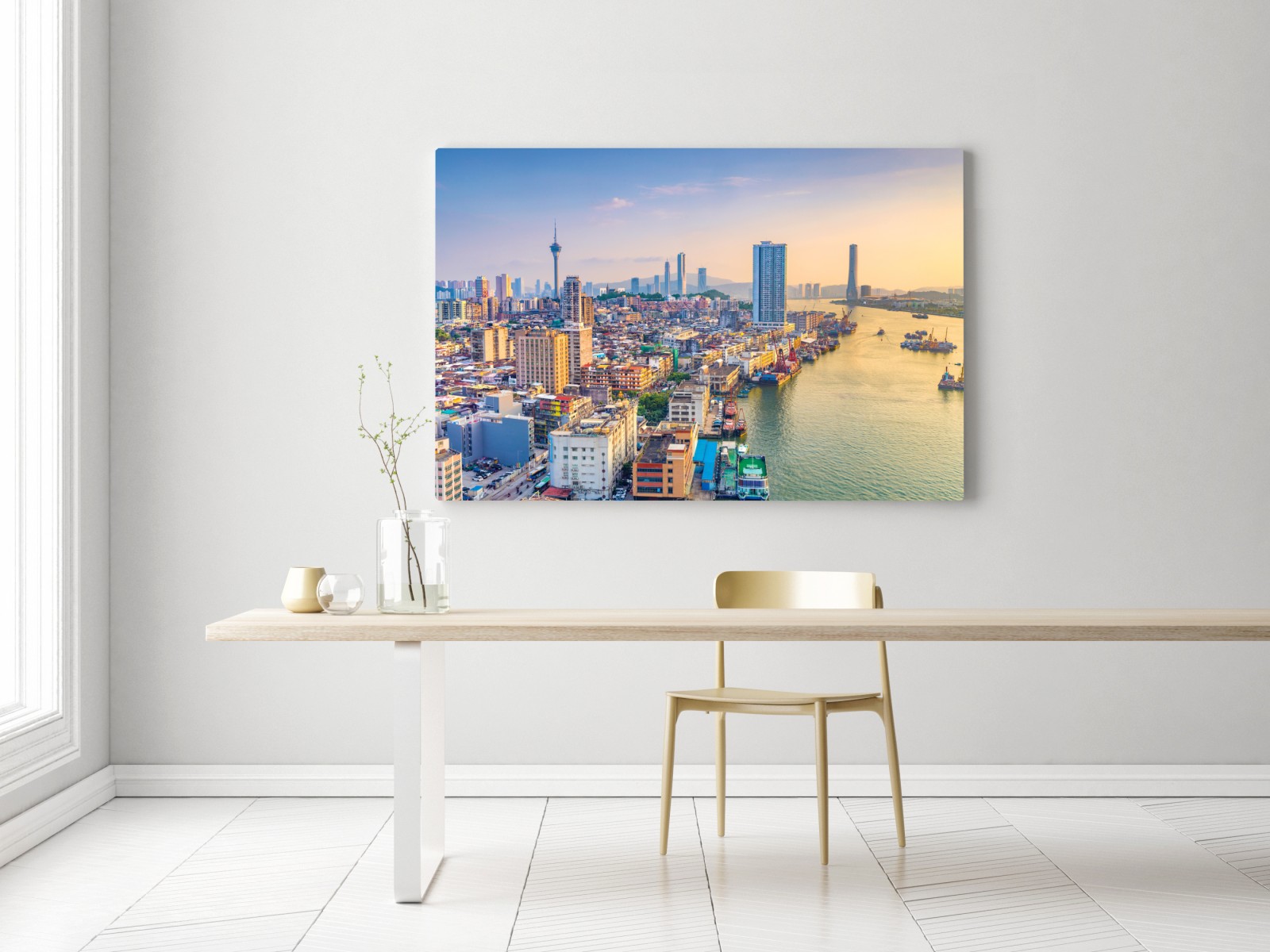 Bringen Sie die lebendige Skyline von Macau mit diesem warmen Stadtbild bei Sonnenuntergang in Ihr Zuhause.MehrWeniger