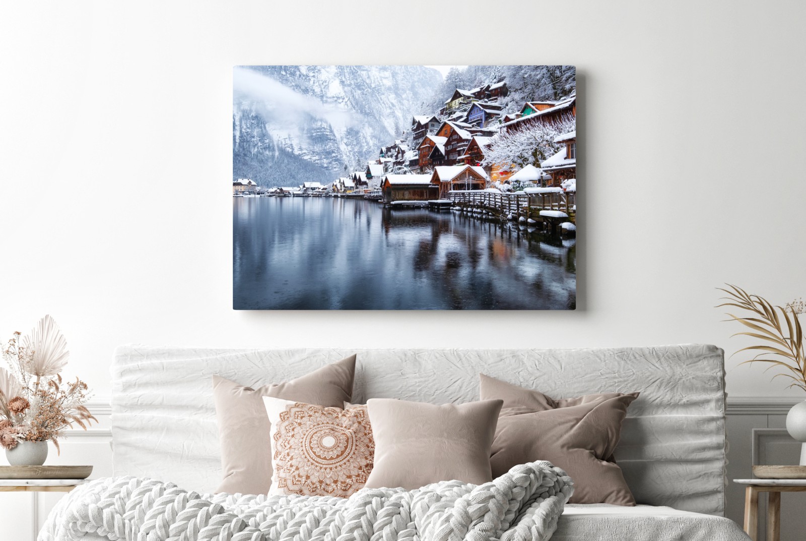 Erleben Sie die ruhige Schönheit des verschneiten Hallstatt, das sich im klaren Alpensee spiegelt und jedem Raum Wärme verleiht.MehrWeniger
