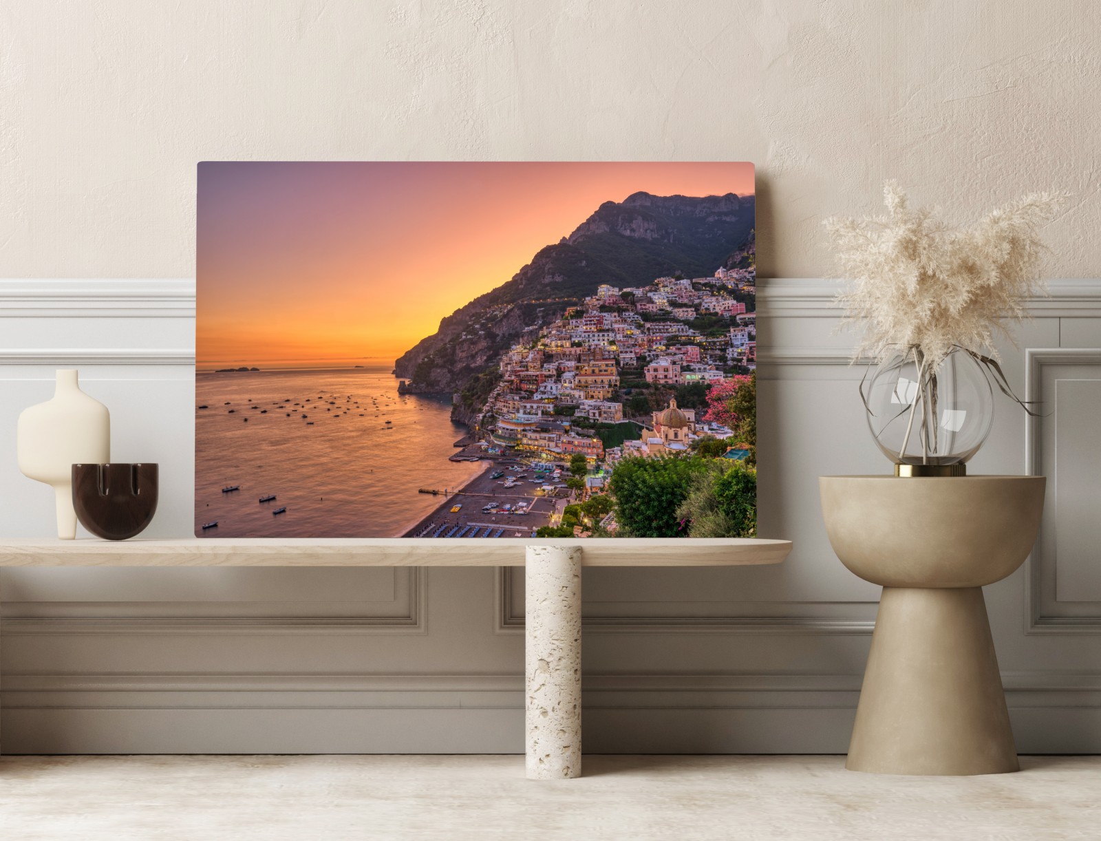 Bringen Sie die goldenen Farbtöne eines Küstensonnenuntergangs in Ihr Zuhause mit dieser Panoramaaufnahme von Positano an der Amalfiküste.MehrWeniger