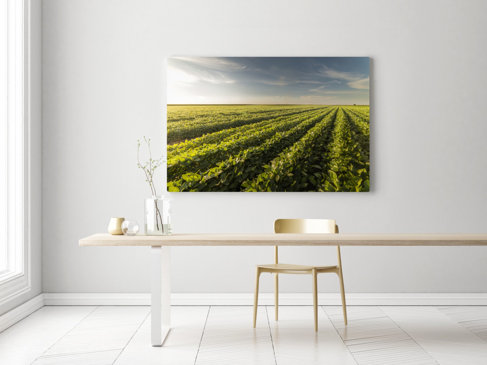 Leinwandbild Sonnenbeschienenes sojafeld bei sonnenuntergang