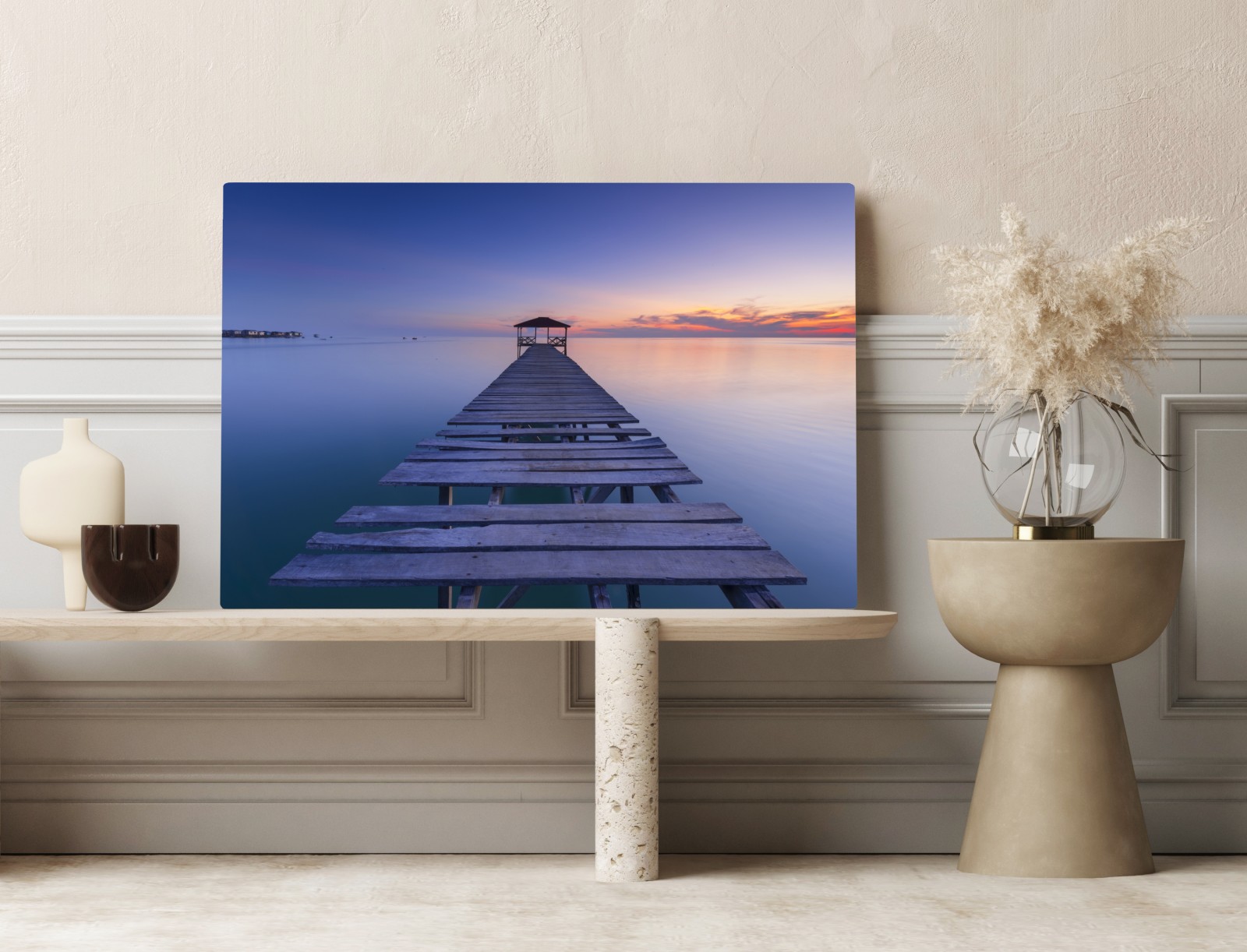 Bringen Sie ruhige Meeresstimmung in Ihr Zuhause mit einem minimalistischen Motiv eines Stegs bei Sonnenuntergang.MehrWeniger
