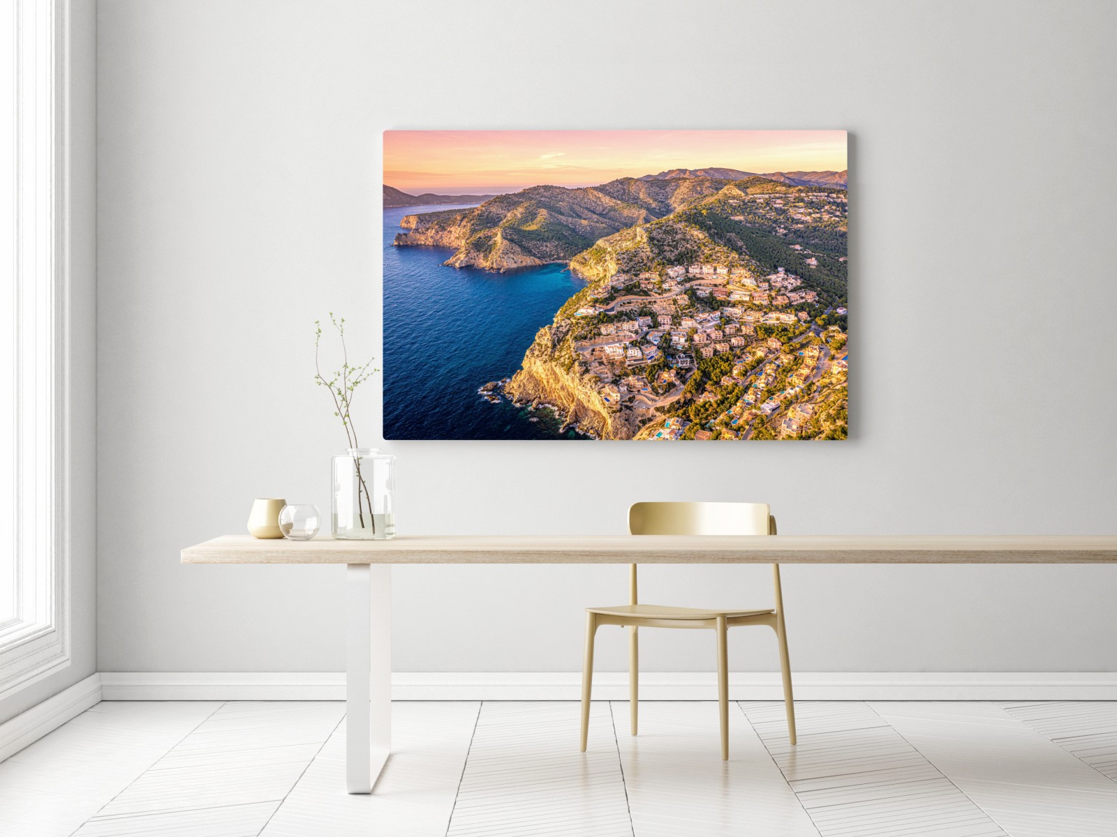 Leinwandbild Sonnenuntergang über küstenlandschaft mit dorf am kliff
