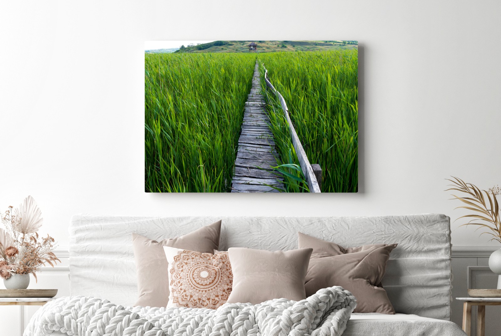 Leinwandbild Ruhiger grüner steg durch schilfland zur rustikalen hütte