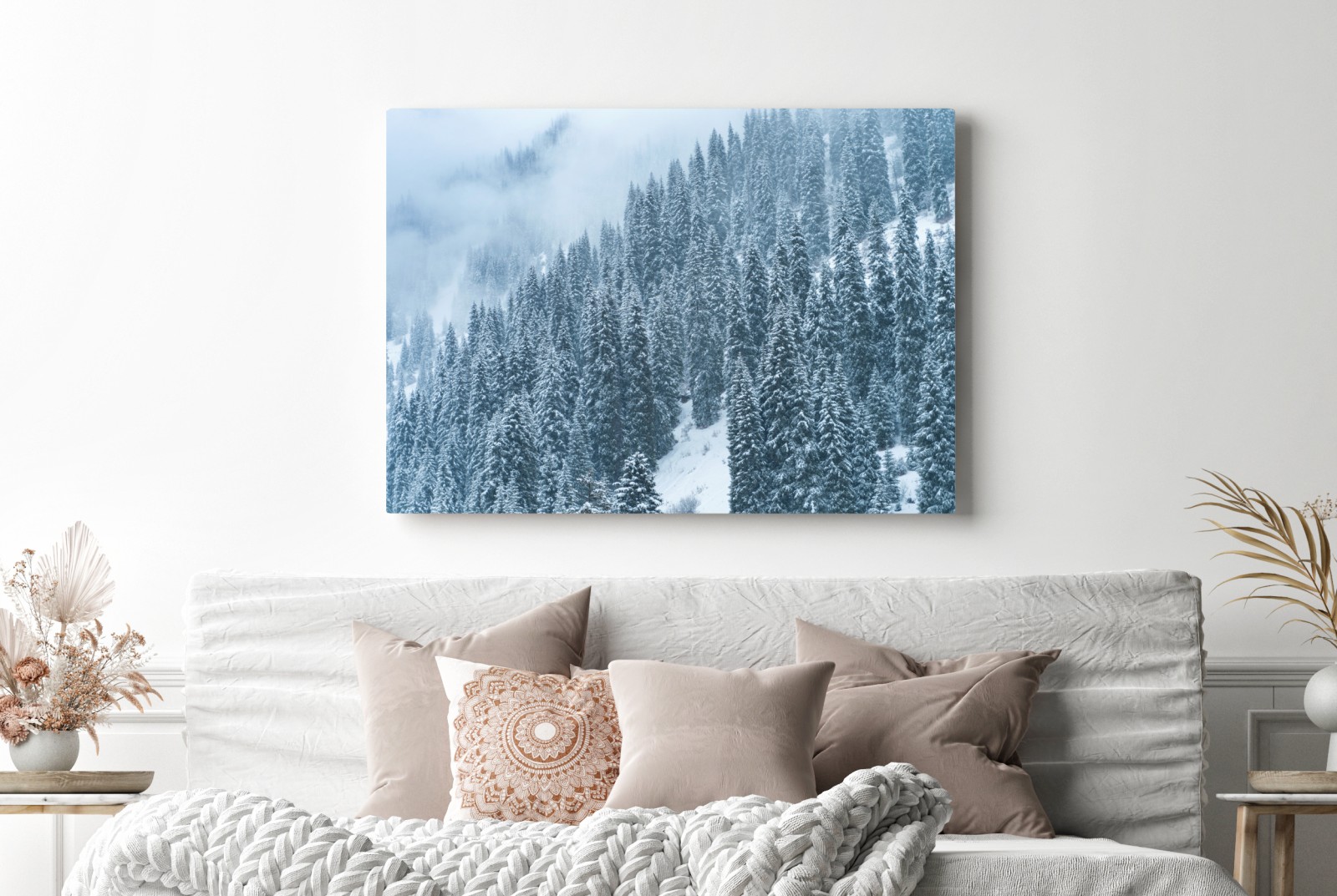 Leinwandbild Nebeliger schneebedeckter kiefernwald
