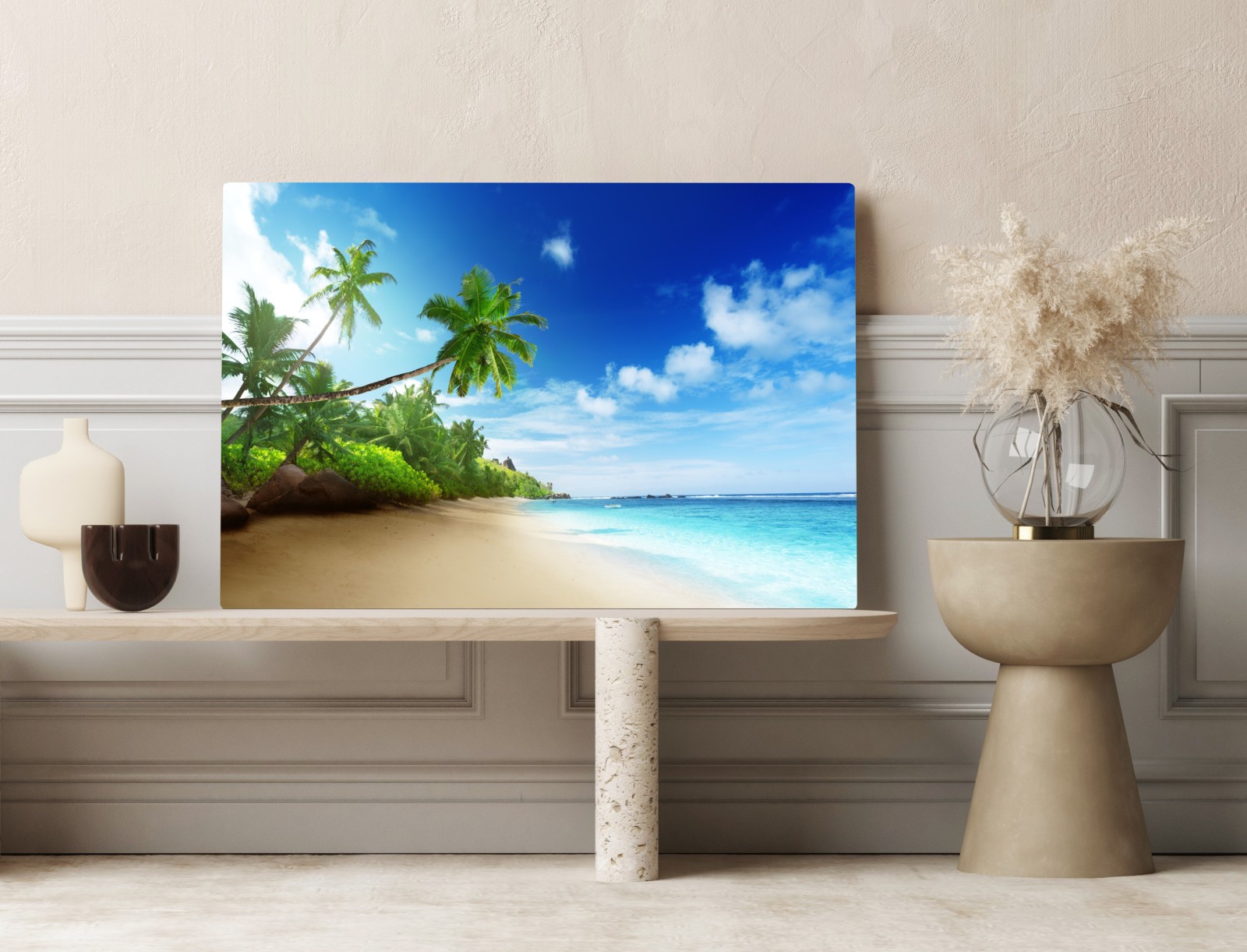 Bringen Sie tropische Ruhe in Ihr Zuhause mit dieser lebendigen Sonnenuntergangsaufnahme vom Strand von Mahe, Seychellen.MehrWeniger