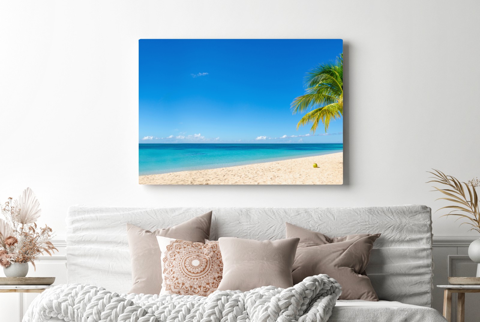 Leinwandbild Tropischer strand mit türkiswasser und palme