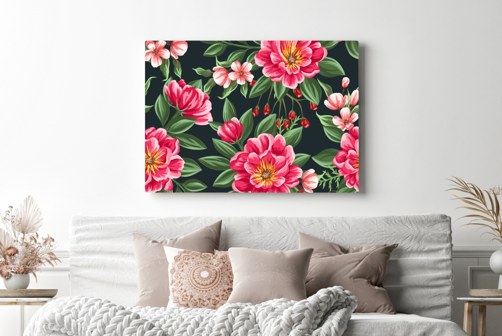 Leinwandbild Rosa aquarell blumenmuster auf dunklem hintergrund