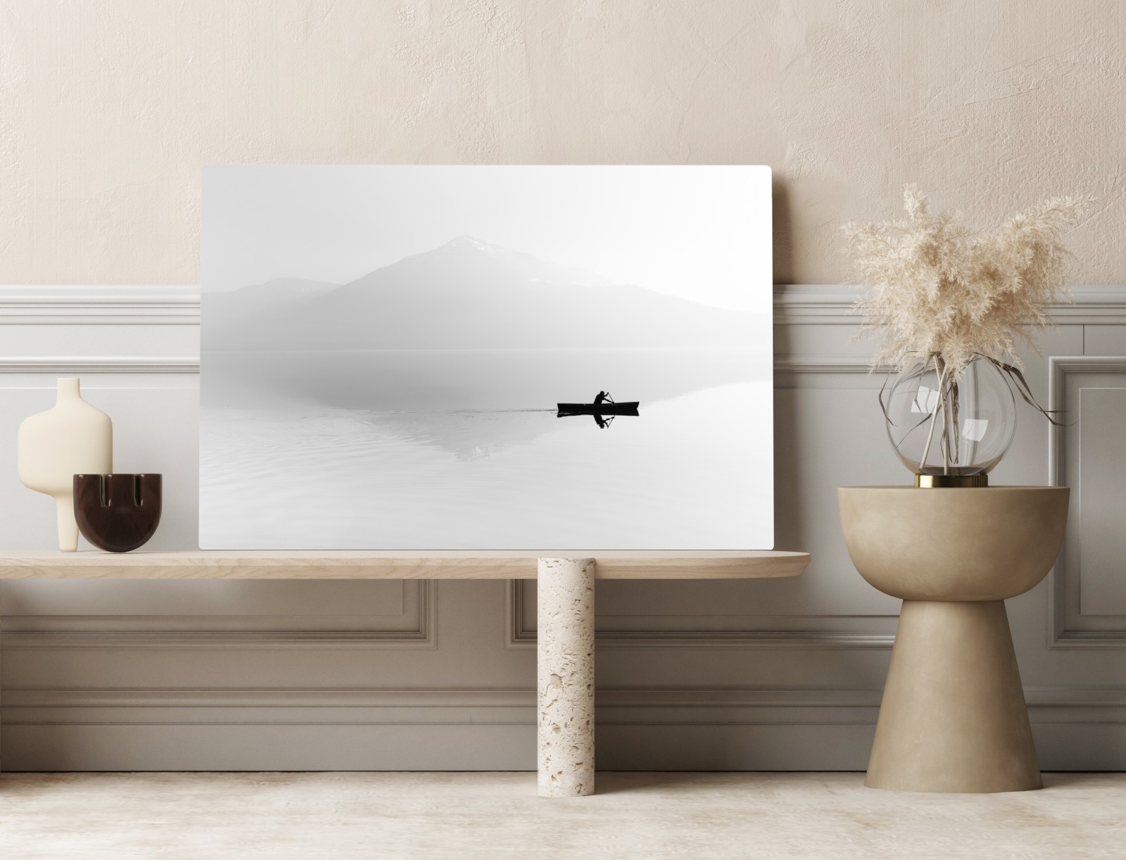 Leinwandbild Einsamer ruderer auf einem nebligen see