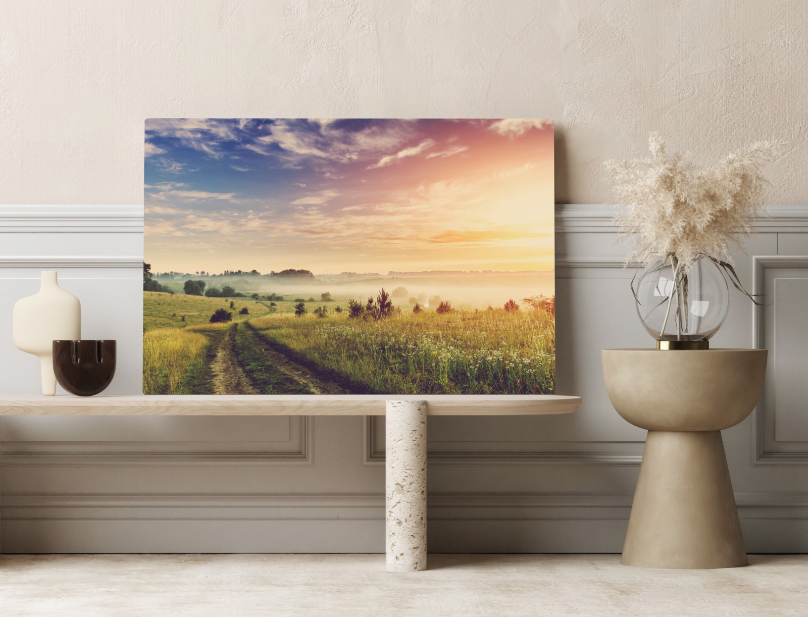 Bringen Sie Ruhe und warmes Licht in Ihr Zuhause mit einem nebeligen Sonnenaufgang über einer ländlichen Wiese.MehrWeniger