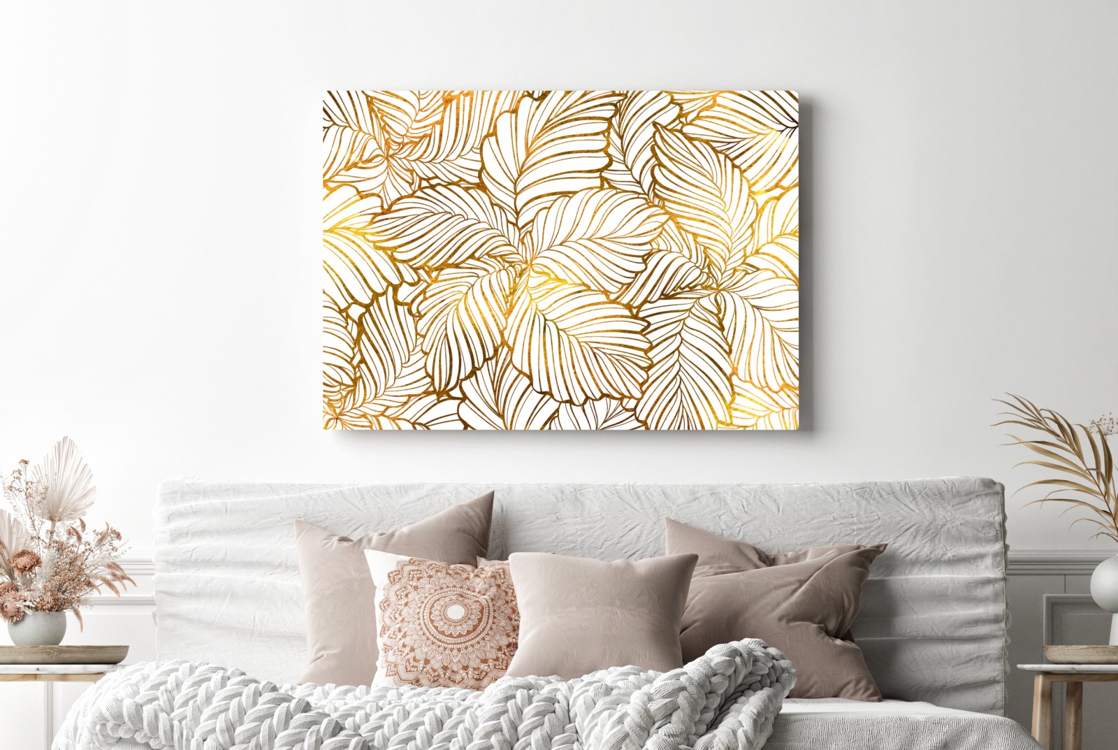 Verleihen Sie Ihrem Raum einen luxuriösen botanischen Touch mit einem goldenen Blattmuster.MehrWeniger
