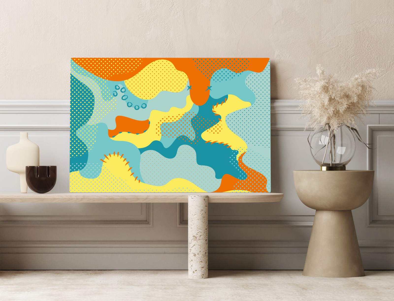 Verwandeln Sie jeden Raum mit kräftigen Formen und energiegeladenen Farben in diesem lebendigen abstrakten Motiv.MehrWeniger