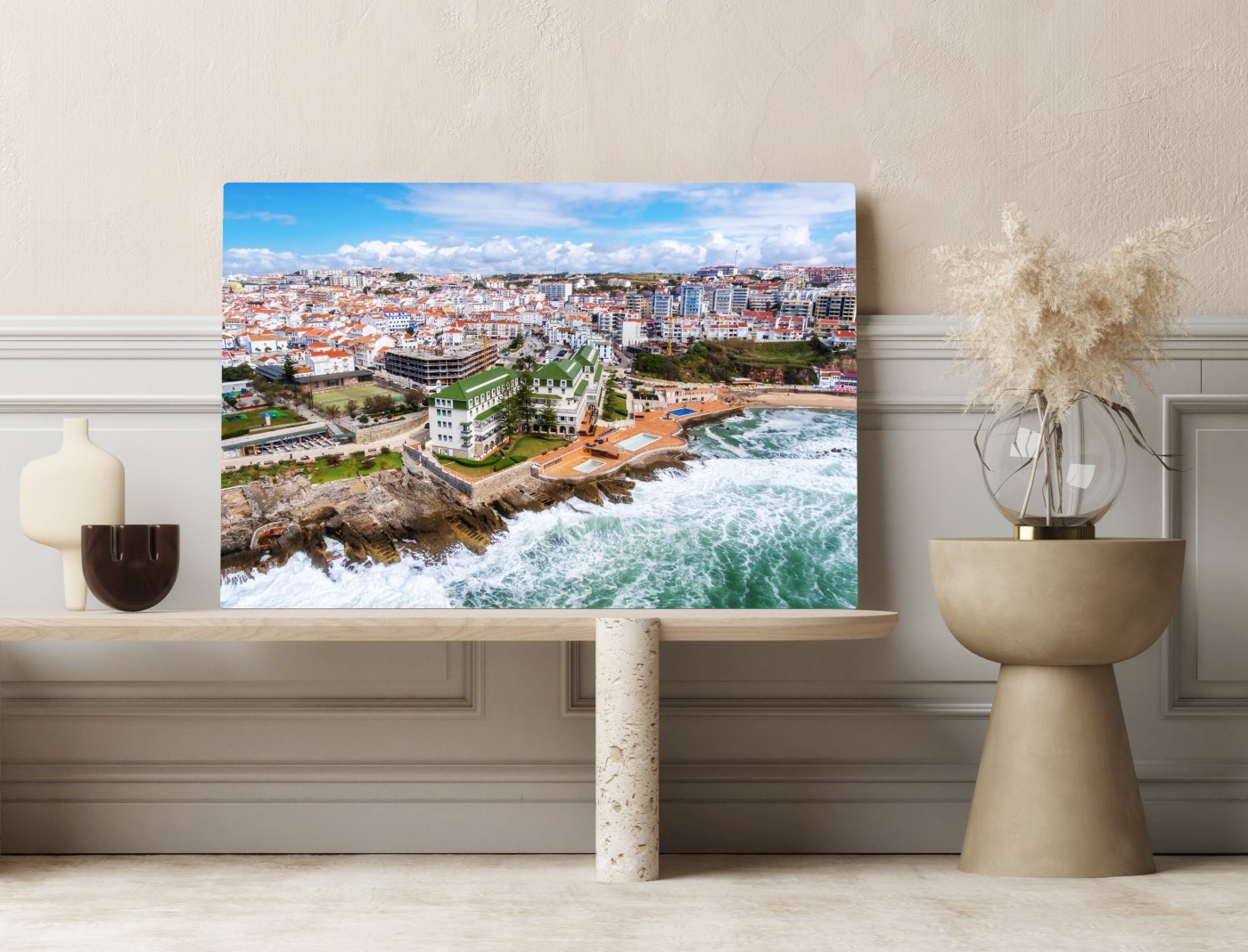 Leinwandbild Luftaufnahme einer küstenstadt mit tosenden wellen