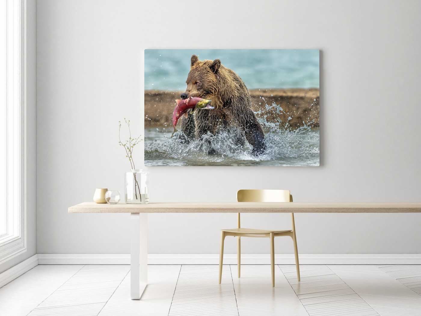 Leinwandbild Braunbär fängt lachs im fluss
