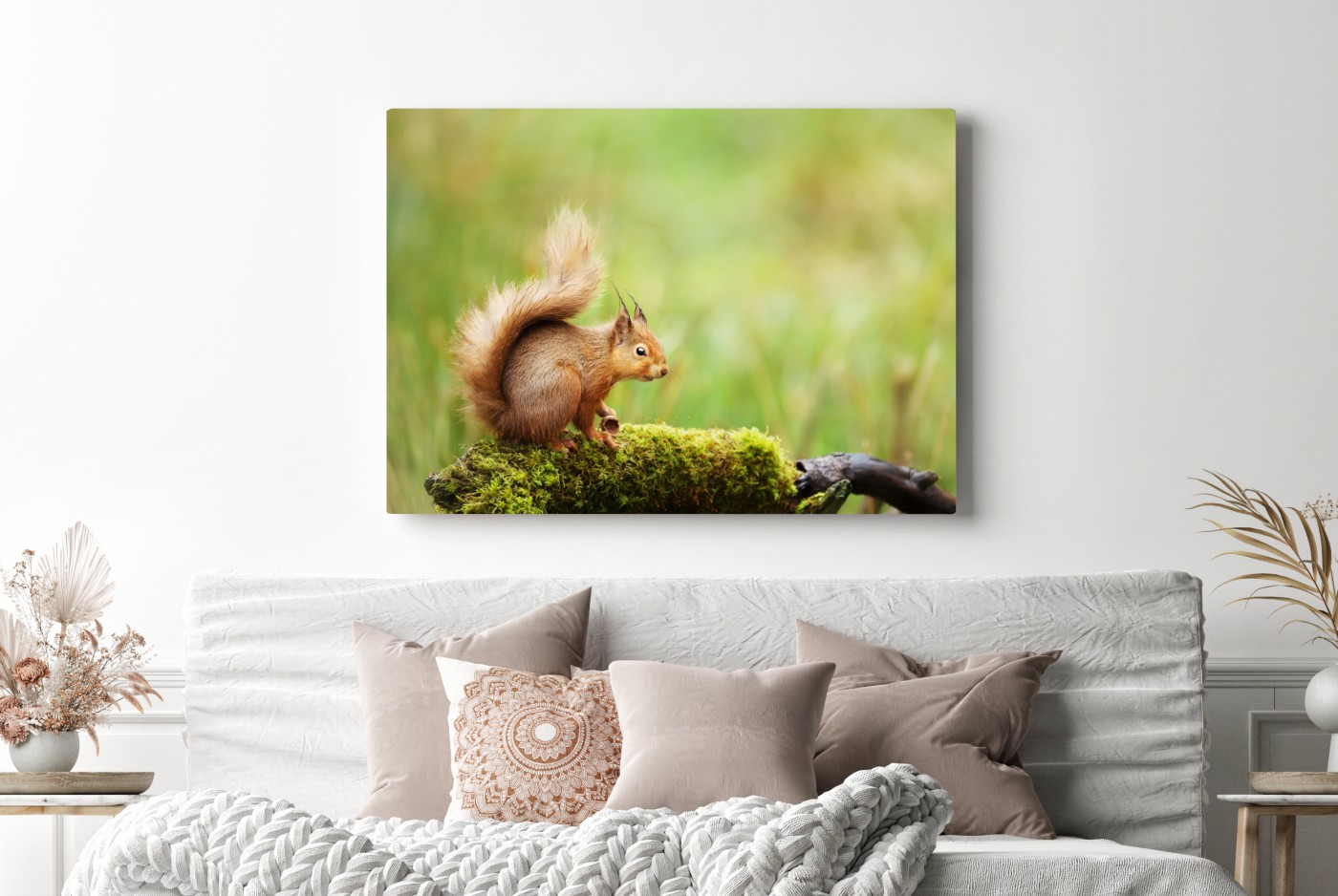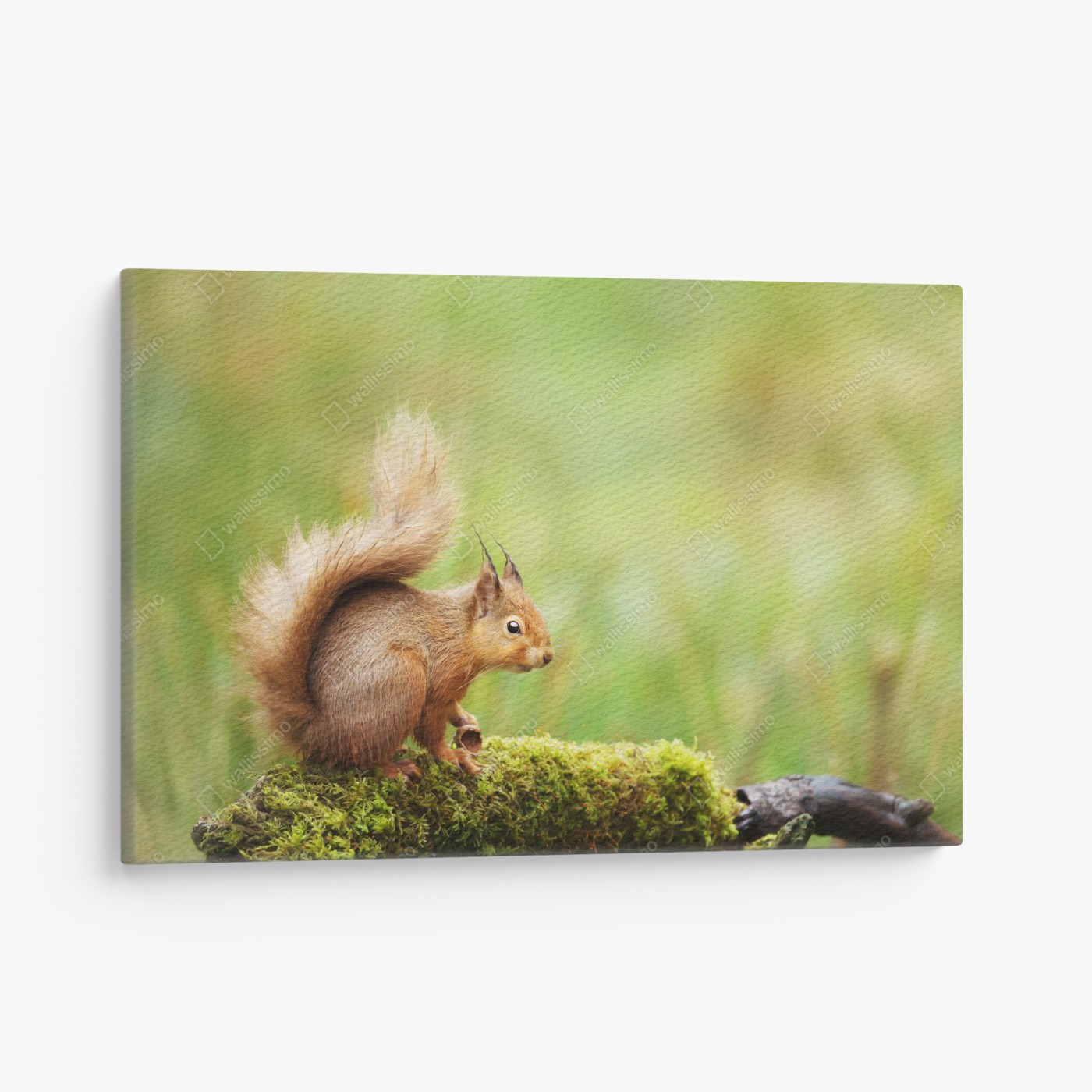 Leinwandbild Rotes eichhörnchen auf moosigem stamm