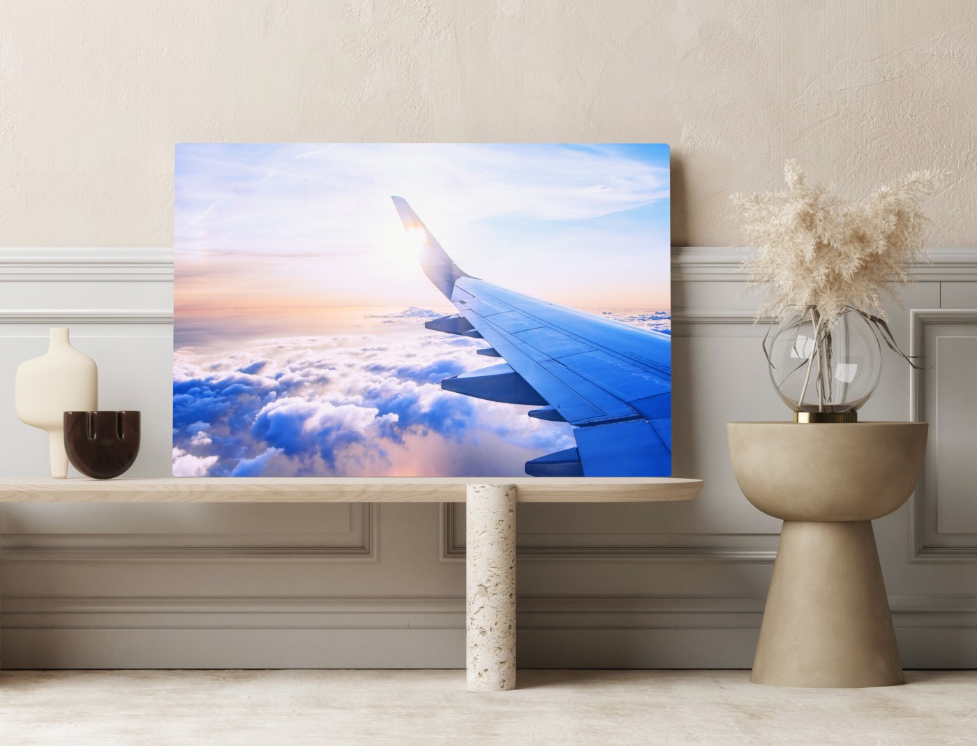 Bringen Sie Ruhe und Fernweh in Ihr Zuhause mit dieser lebendigen Luftaufnahme über den Wolken, die ein Flugzeugflügel und dramatische Sonnenfarben zeigt.MehrWeniger