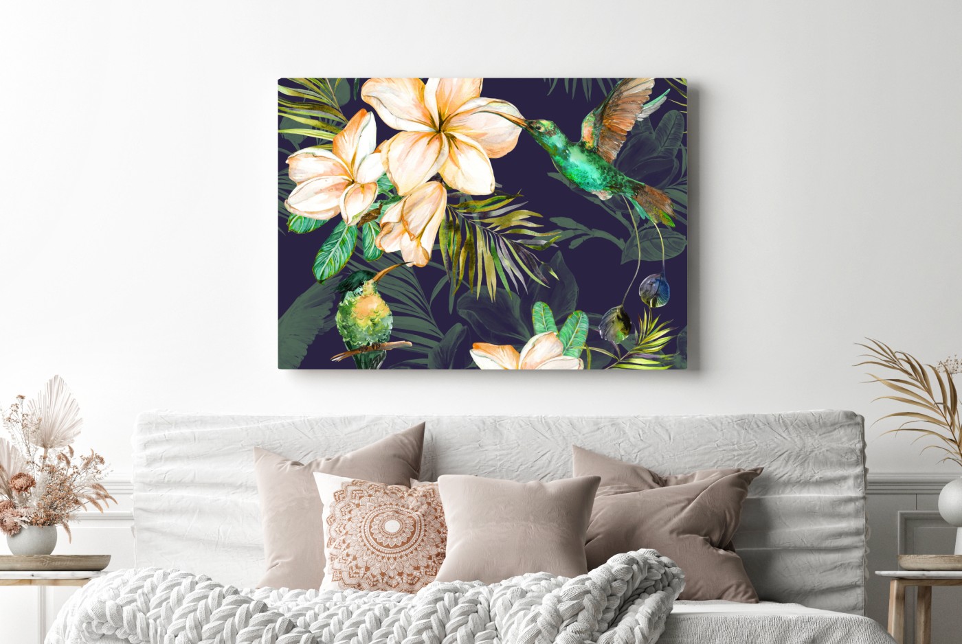 Leinwandbild Tropische kolibris und plumeria in aquarell
