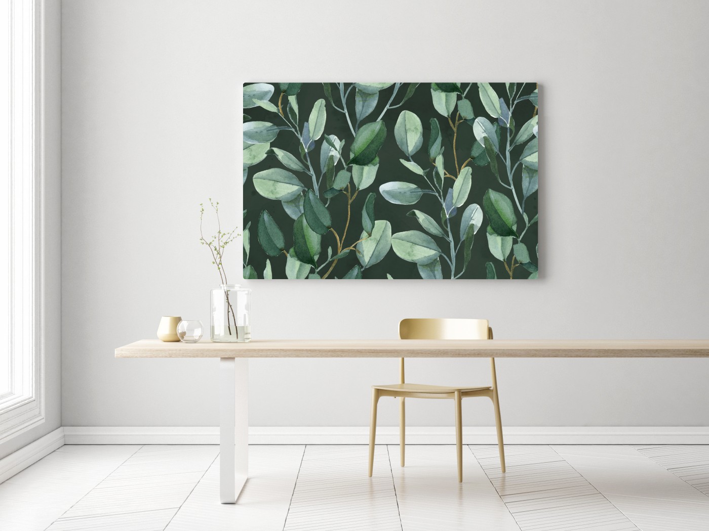 Leinwandbild Aquarell eukalyptusblätter muster auf dunkelgrünem hintergrund