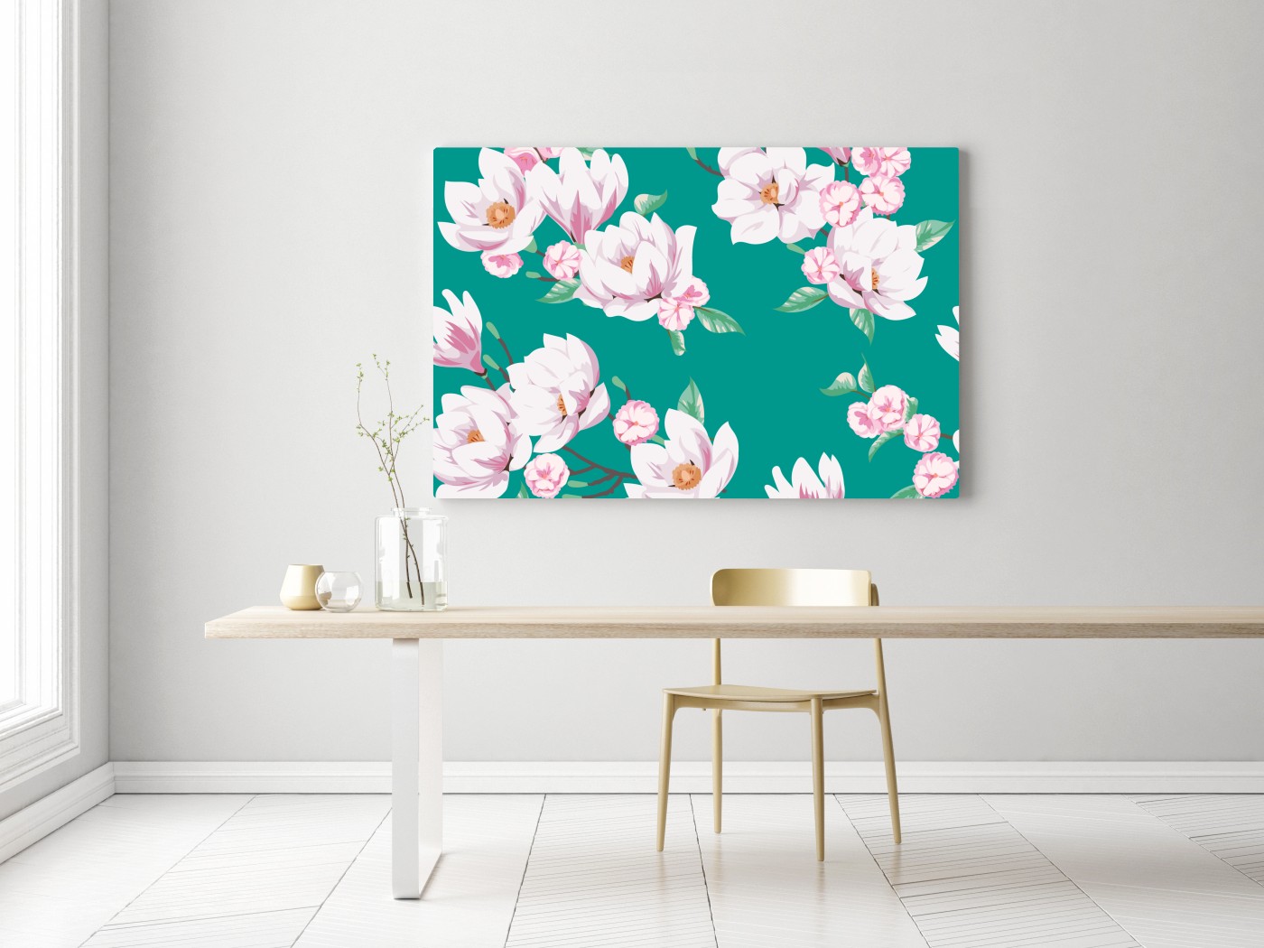 Leinwandbild Pastell magnolienmuster auf türkisfarbenem hintergrund