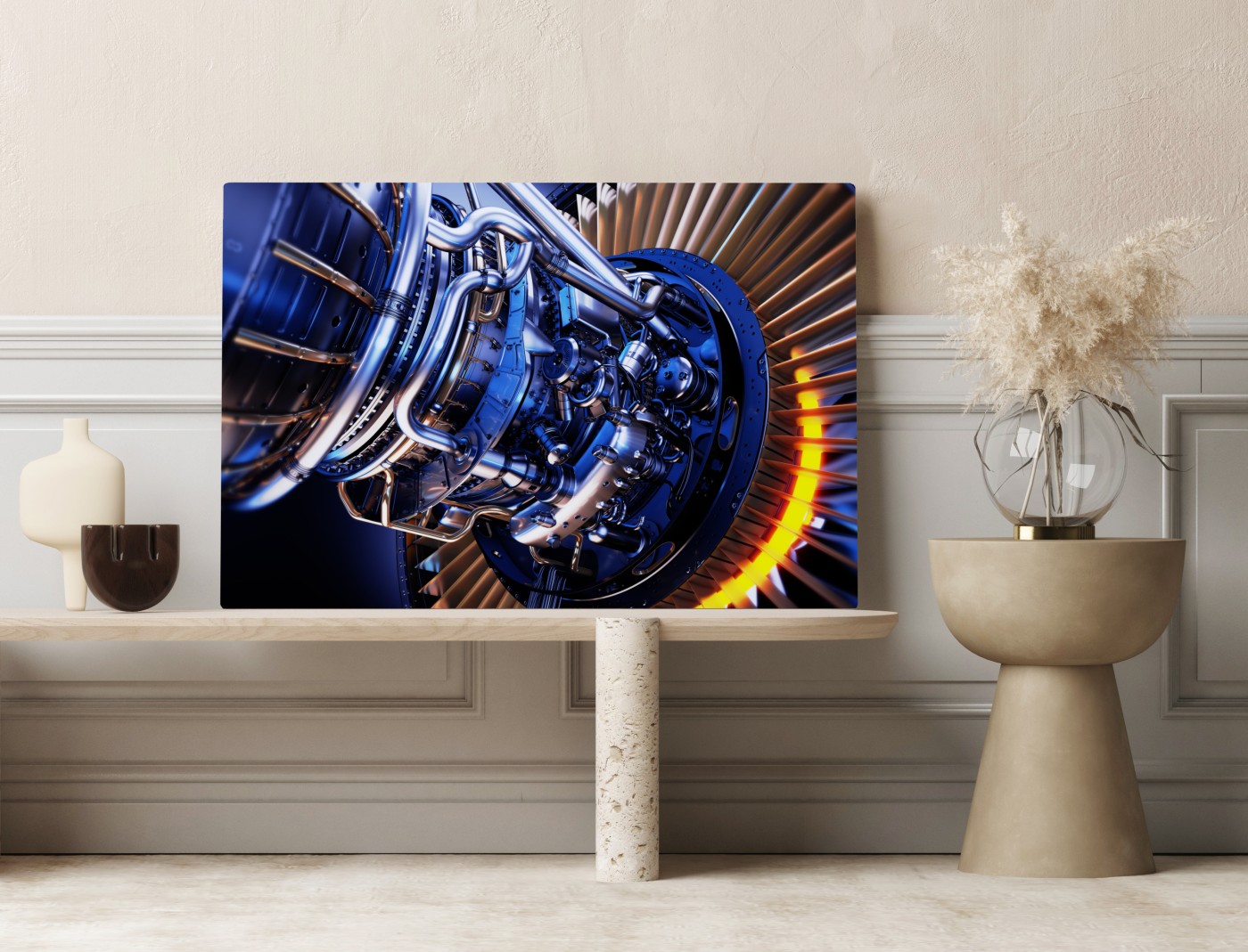 Leinwandbild Nahaufnahme einer turbinenanlage in blau und orange
