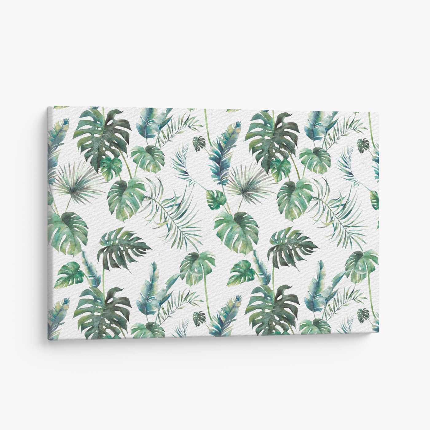 Bringen Sie tropisches Flair in Ihr Zuhause mit diesem Aquarellmuster aus Monstera- und Palmenblättern auf weißem Hintergrund.MehrWeniger