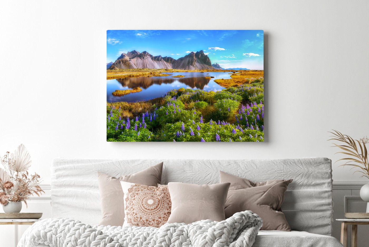 Leinwandbild Lebendige lupinenwiesen bei Vestrahorn, Island