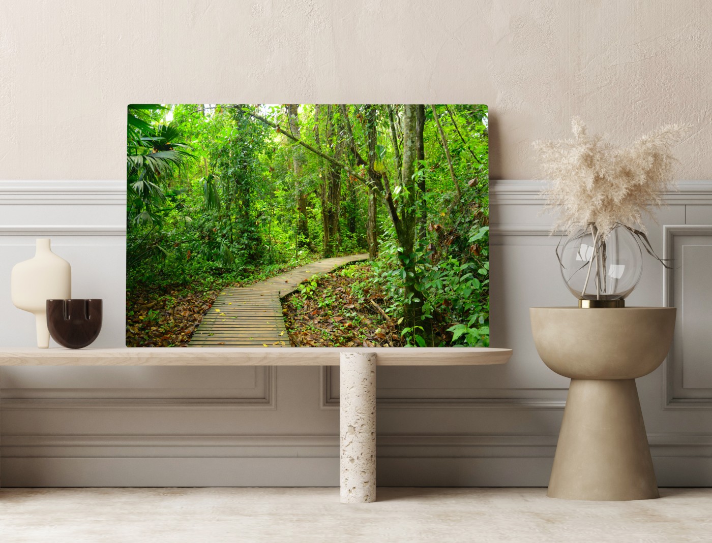Bringen Sie die beruhigende Atmosphäre eines tropischen Regenwaldes in Ihr Zuhause mit dieser üppigen Stegszene.MehrWeniger