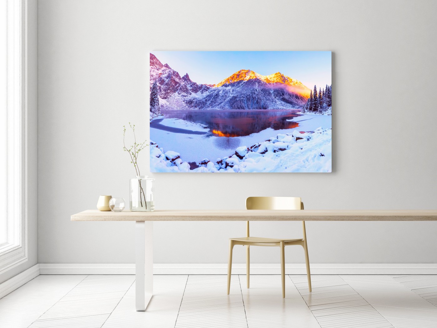 Leinwandbild Sonnenbeschienene berge über gefrorenem alpensee