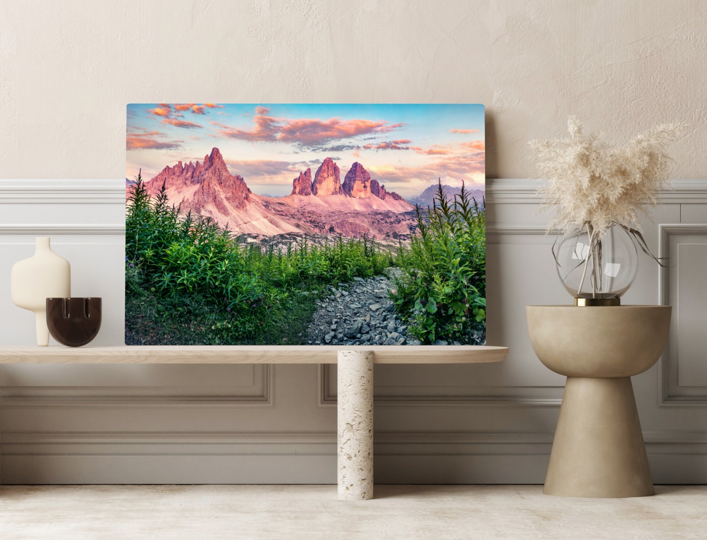 Bringen Sie die ruhige Schönheit der Dolomiten in Ihr Zuhause mit dieser lebendigen Sonnenuntergangsaufnahme der Tre Cime di Lavaredo, ideal als natürlicher Blickfang im Raum.MehrWeniger