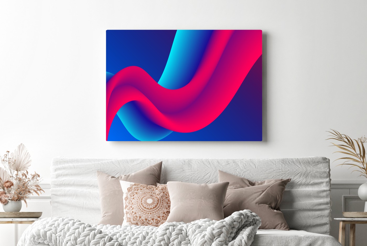 Verleihen Sie Ihrem Raum Energie mit leuchtenden fließenden Verlaufswellen in kräftigen Pink- und Türkistönen, ideal für moderne Innenräume.MehrWeniger