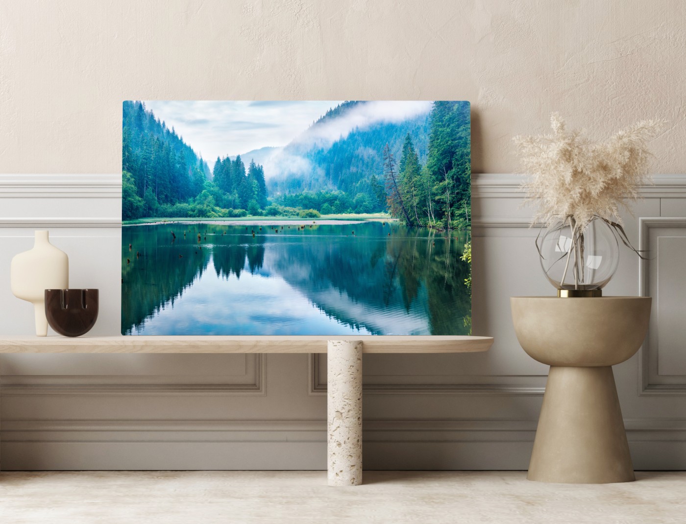 Leinwandbild Nebliger morgen am see Lacu Rosu, Rumänien