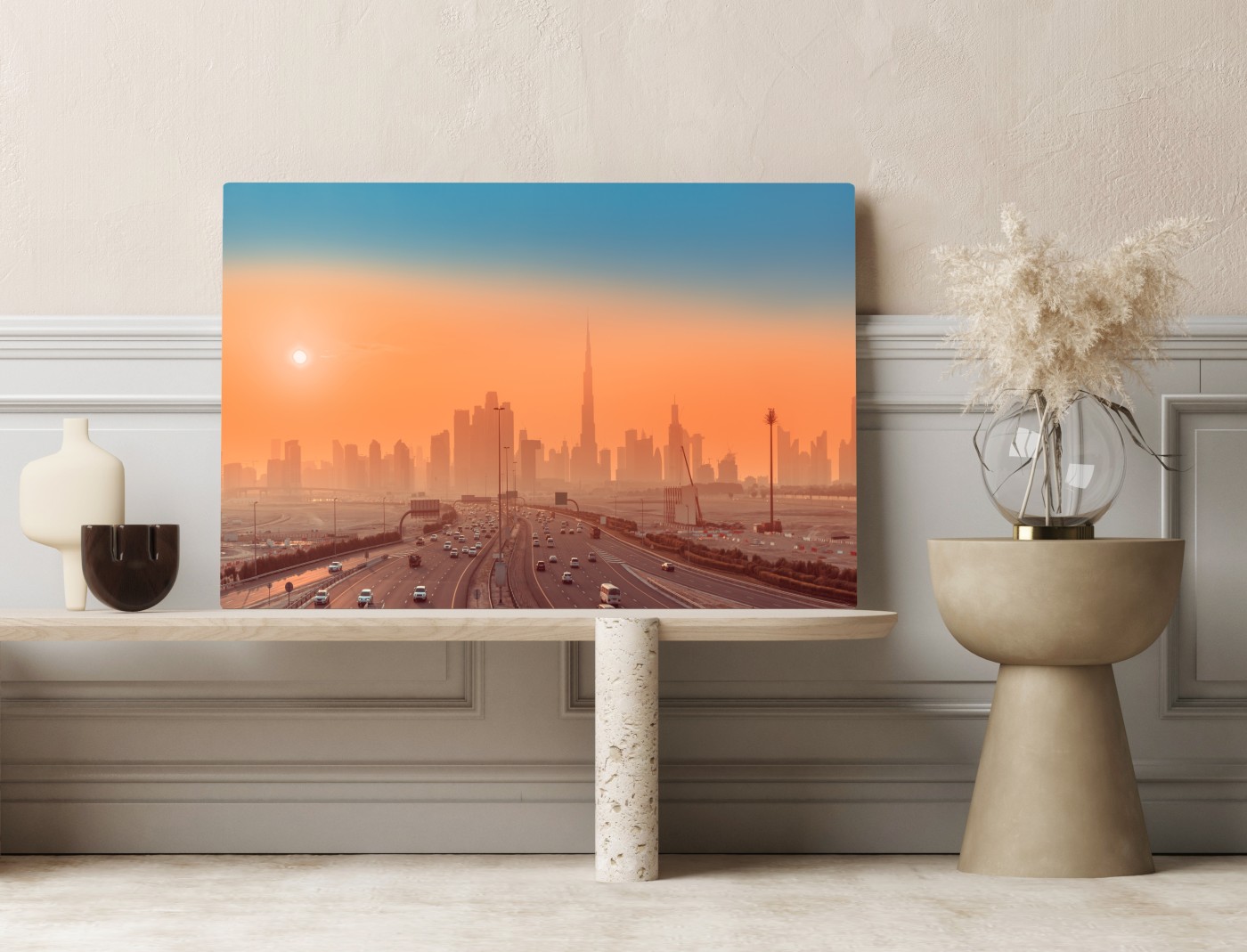 Leinwandbild Dubai skyline bei sonnenaufgang