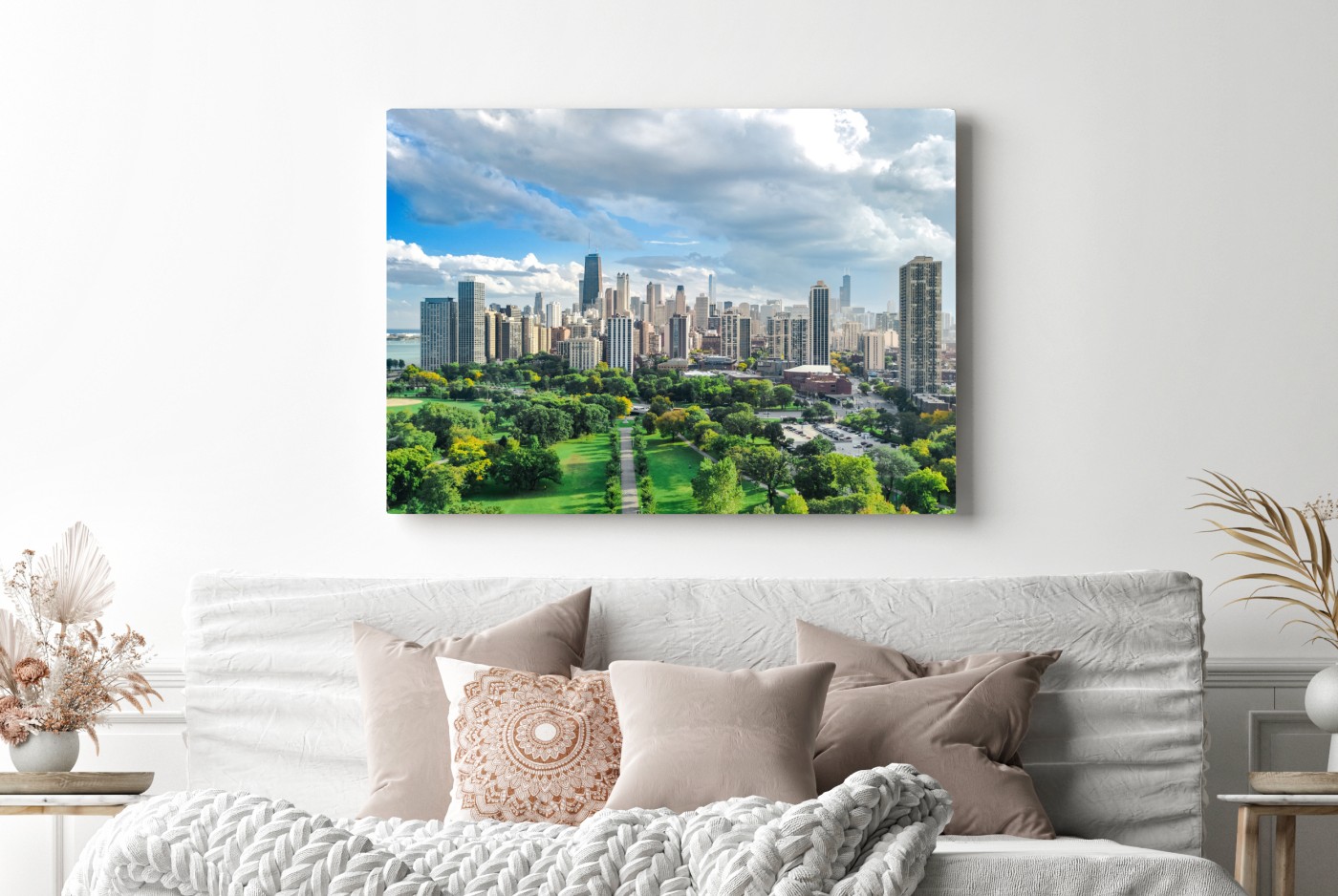Bringen Sie die lebendige Energie einer Stadtsilhouette und eines grünen Parks in Ihren Raum mit diesem ausdrucksstarken Stadtbild.MehrWeniger