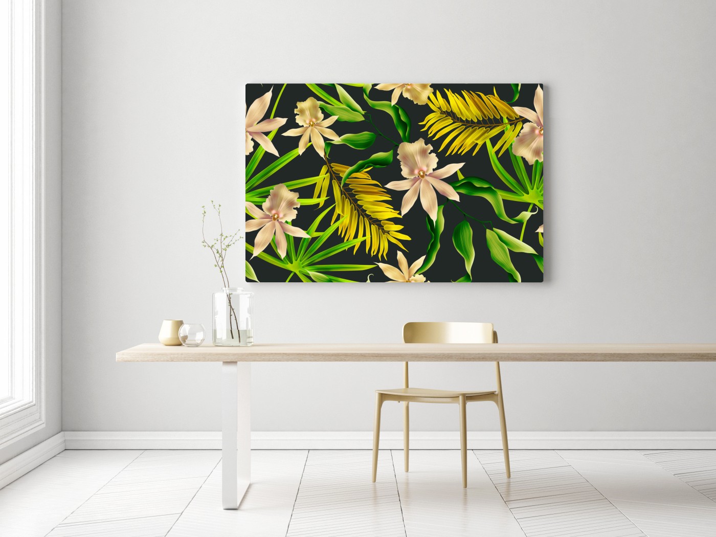 Leinwandbild Tropisches orchideenmuster auf dunklem hintergrund