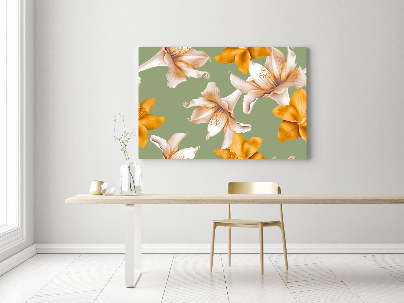 Bringen Sie Natur ins Zuhause mit diesem eleganten Motiv goldener Lilien auf sanftem grünem Hintergrund, ideal um jedem Raum eine frische, moderne Note zu verleihen.MehrWeniger