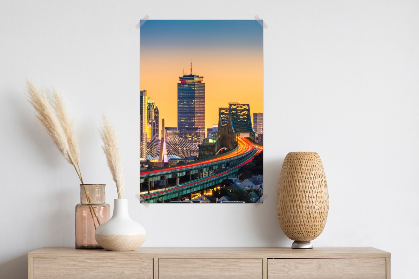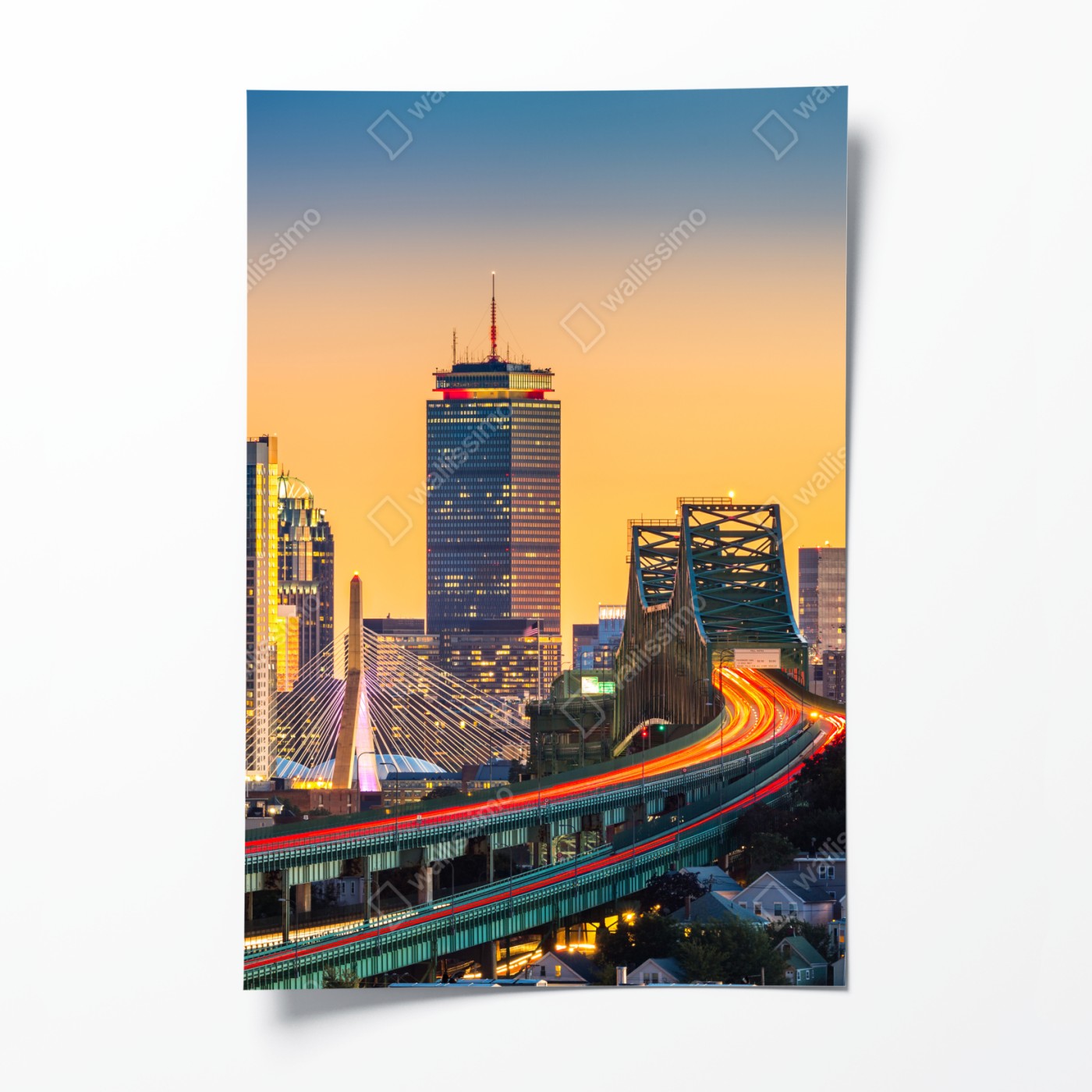 Poster Panorama von Boston bei sonnenuntergang mit Zakim und Tobin brücken