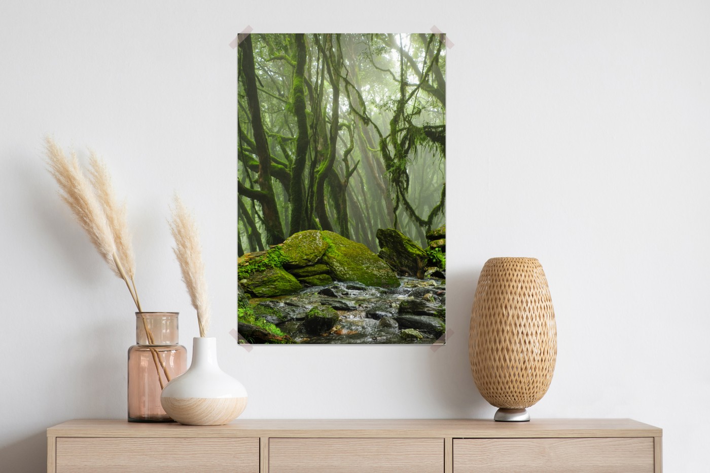 Poster Moosiger wald mit bach im nebel