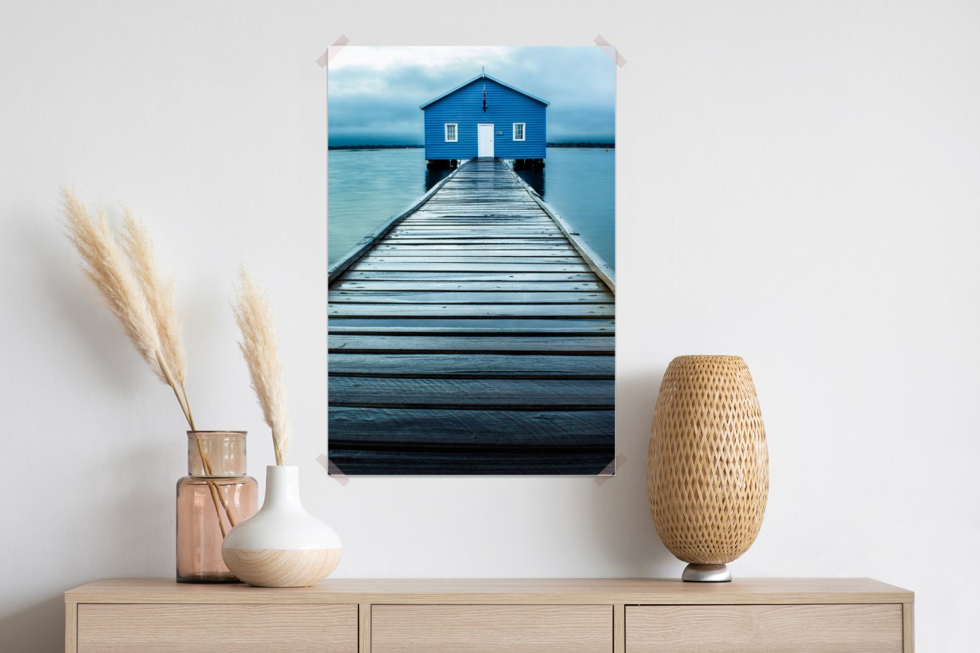 Poster Blaues bootshaus am ende des stegs
