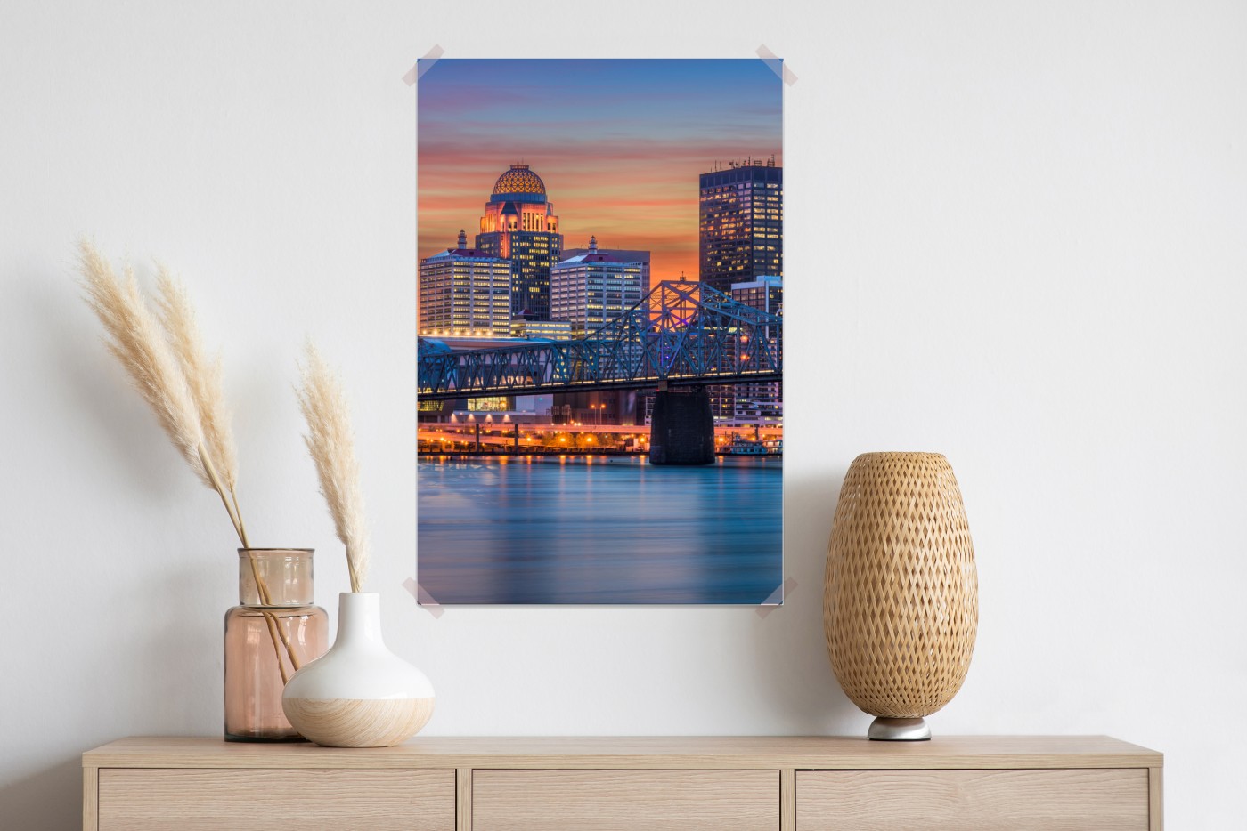 Bringen Sie die lebendige Flussufer-Skyline von Louisville in Ihre Räume mit diesem eindrucksvollen Stadtbild bei Sonnenuntergang, ideal für Wohnzimmer oder Büro.MehrWeniger