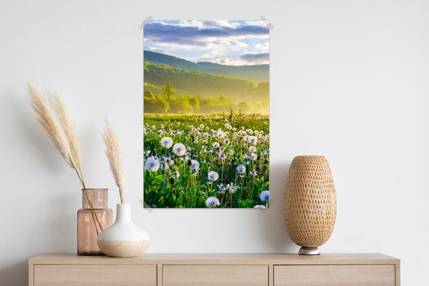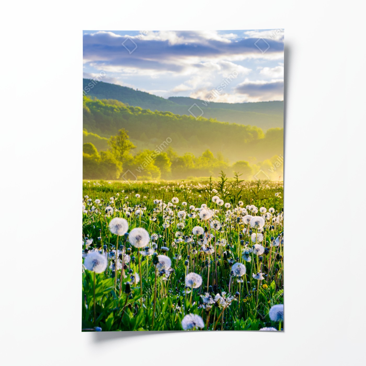 Poster Neblige löwenzahnwiese im sonnenaufgang