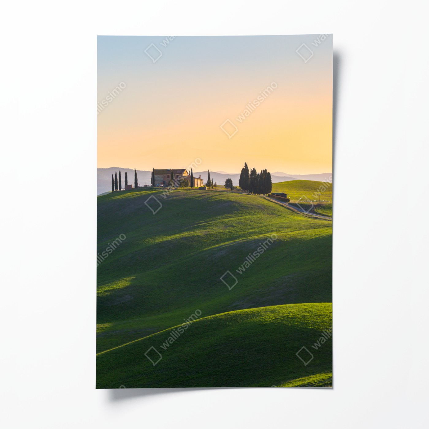Fange die ruhige Schönheit der sanften grünen Hügel und eines abgelegenen Bauernhauses in Crete Senesi bei Sonnenuntergang ein, perfekt, um ländliche Wärme und Ruhe an Ihre Wände zu bringen.MehrWeniger