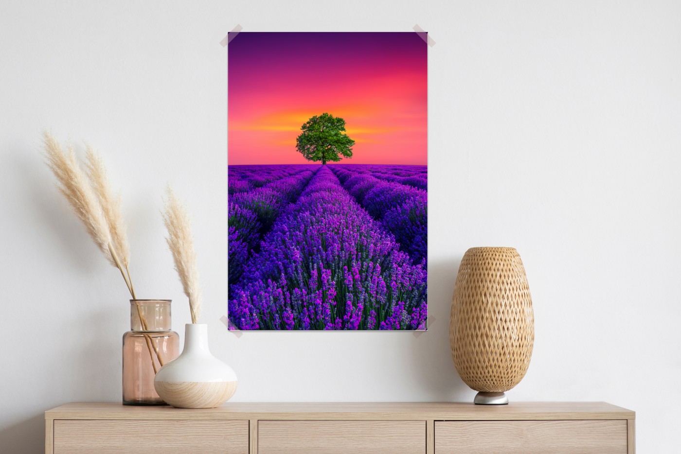 Poster Lavendelfeld bei sonnenuntergang mit einsamem baum