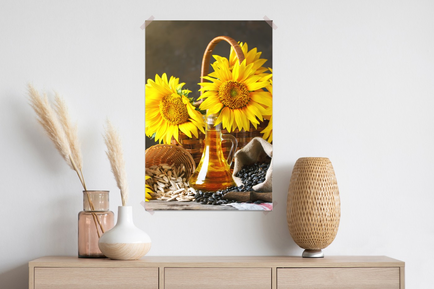 Poster Leuchtendes stillleben mit sonnenblumen, kernen und öl