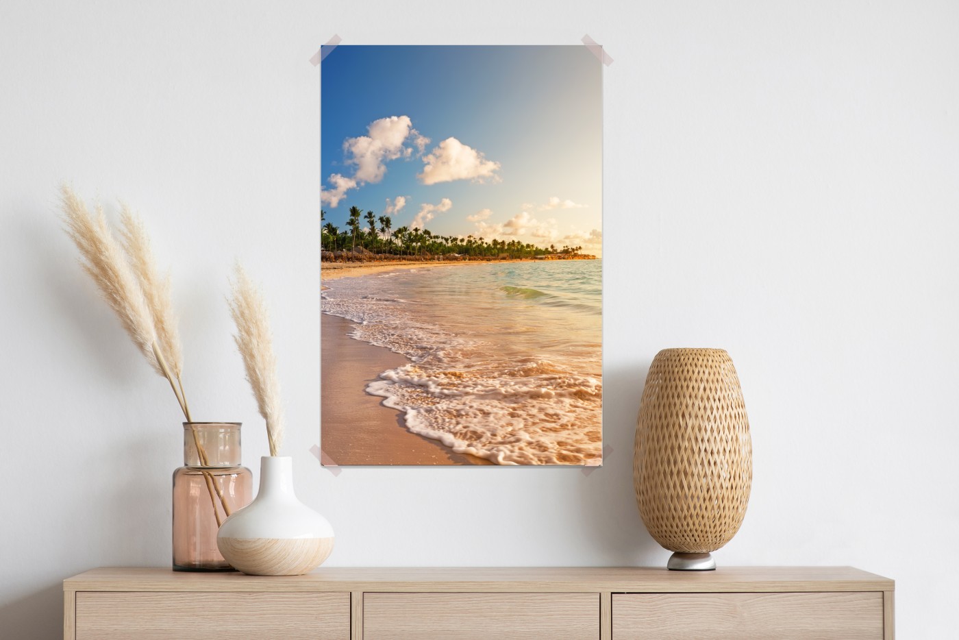 Poster Tropischer sonnenuntergang am strand mit palmensilhouetten