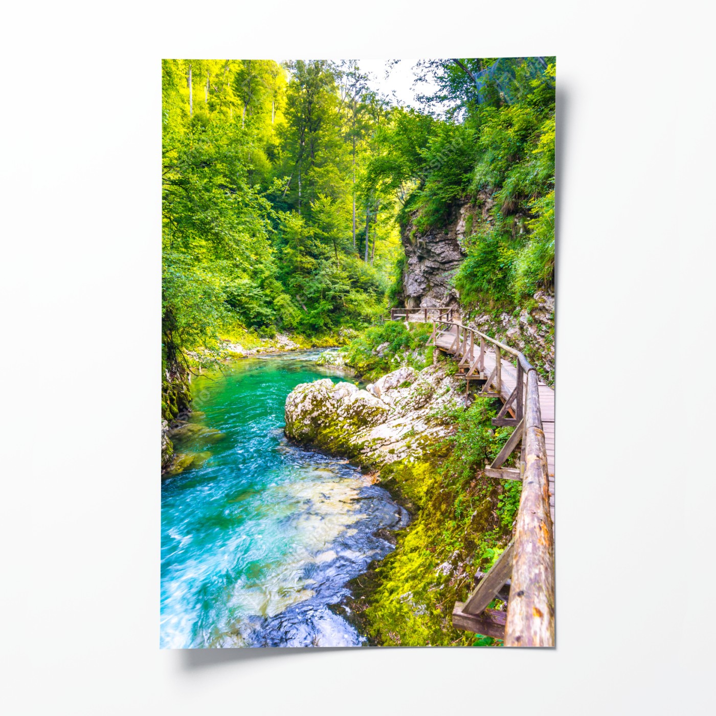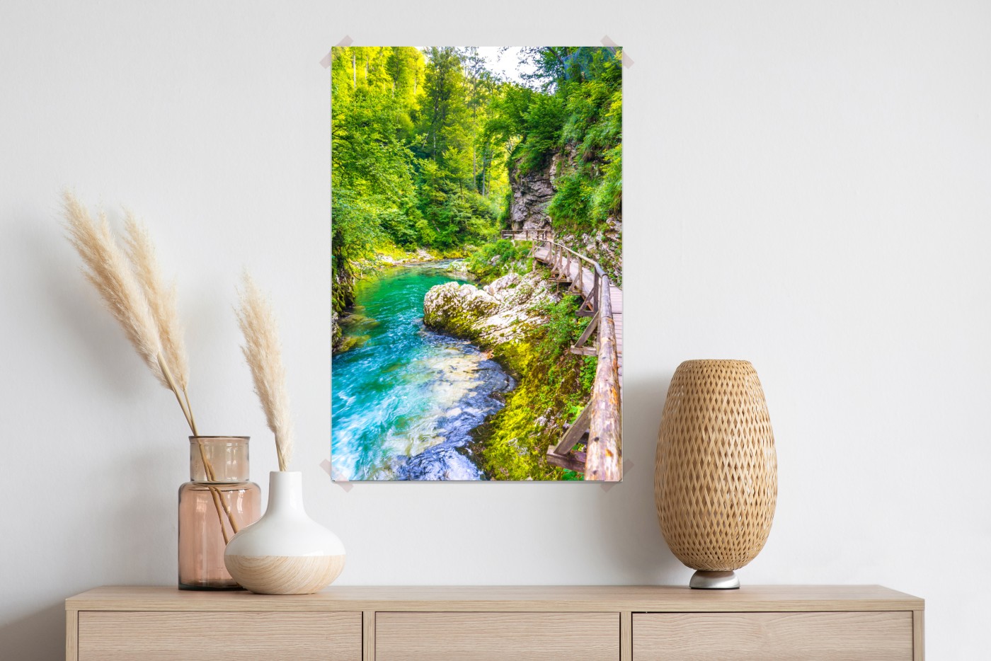 Poster türkisfarbener fluss und holzsteg im wald – Wallnifity®