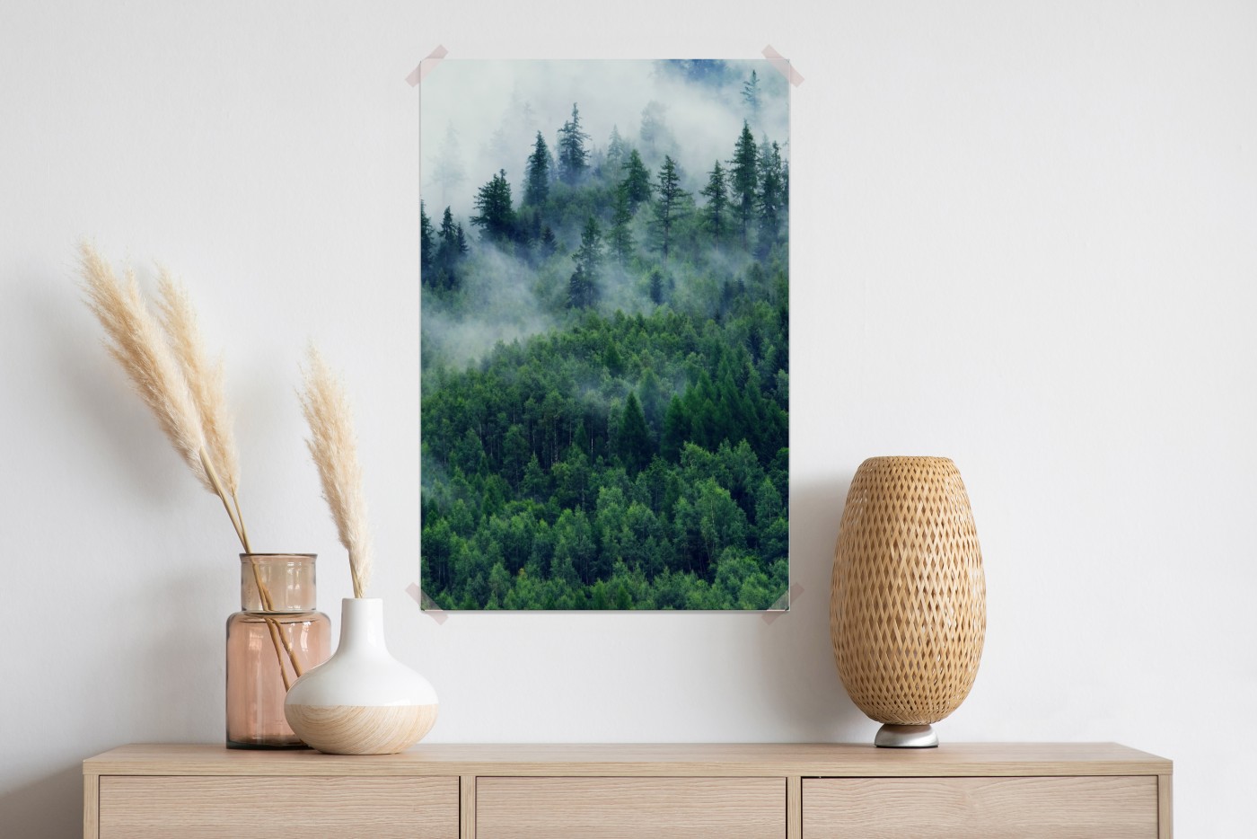 Bringen Sie beruhigende Waldatmosphäre in Ihr Zuhause mit dieser nebligen grünen Landschaft, die dichte Nadelbäume und sanften Nebel einfängt.MehrWeniger