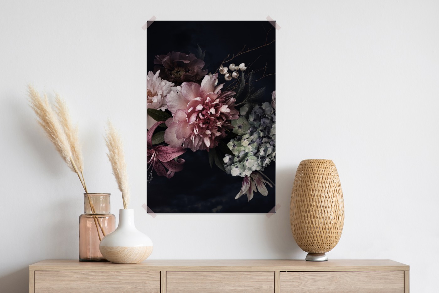 Poster Düsterer pfingstrosen- und hortensienstrauß